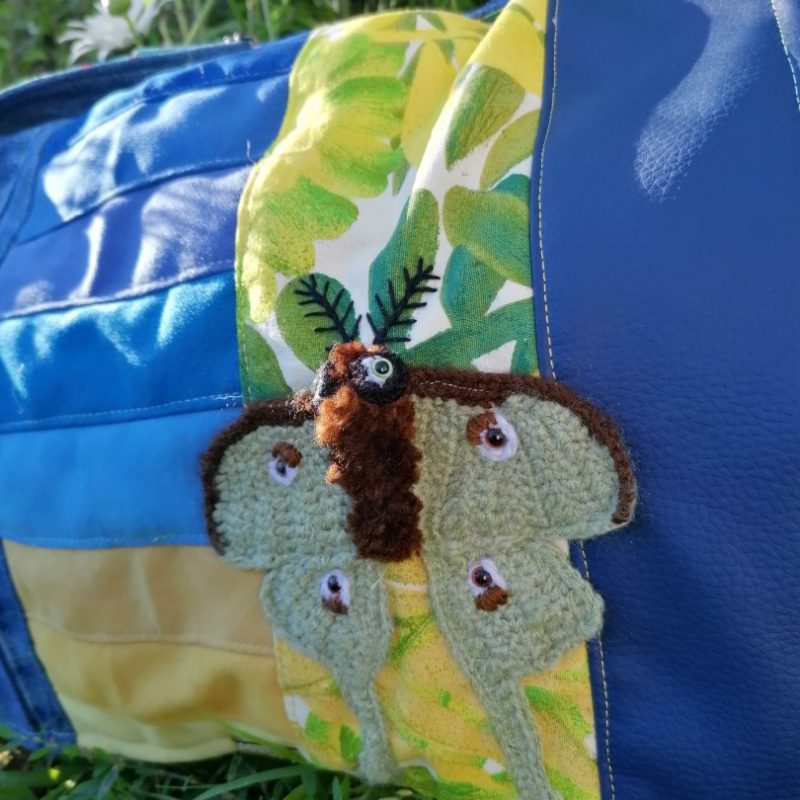 Petite Besace, » Poireau » , tissus de tapissier, jean, fourrure synthétique et coton