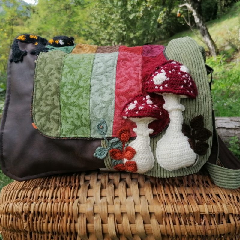 Mini Besace de survie, sacoche , « Mushroom times in autumn » , velours, simili , tissus d’ameublement ,girole en crochet et coton