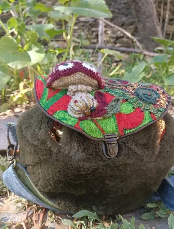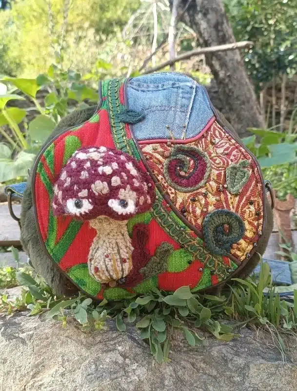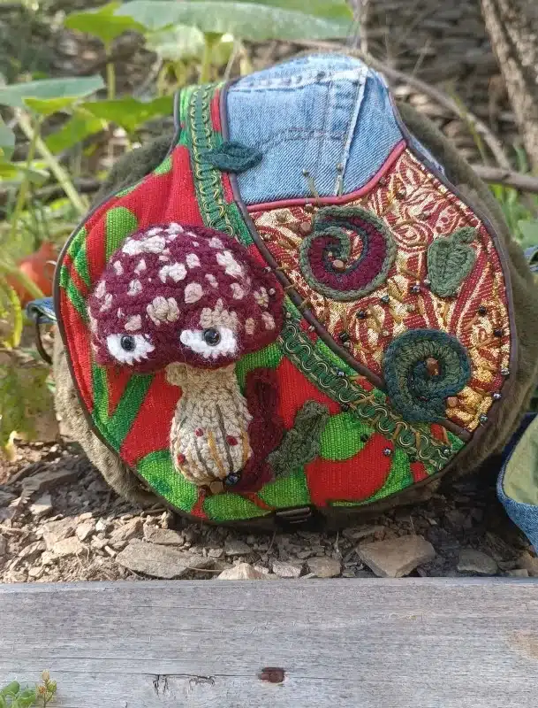 La caraboule , sac ,Besace ronde , Champifou , Gardien des Esprits Éclos de la Mousse , Cotons, jean’s u’pcycler, Fausse fourrure champifou crocheter