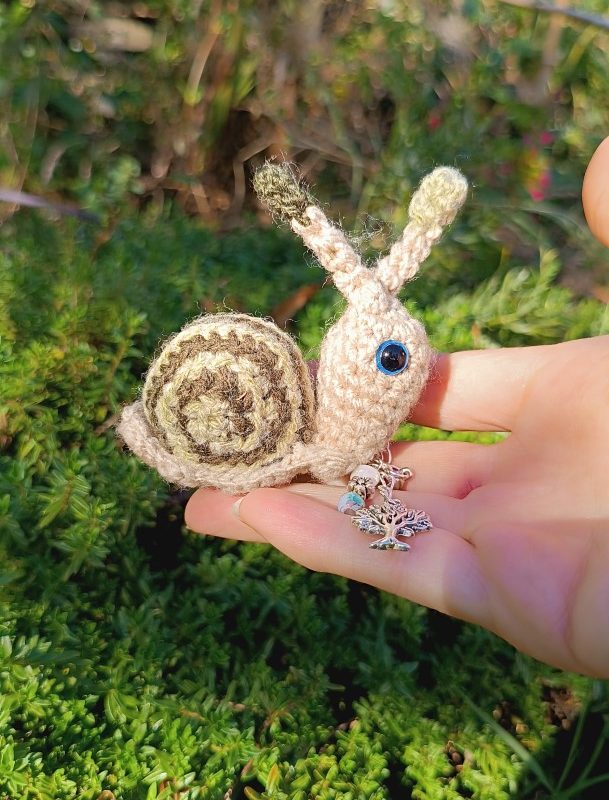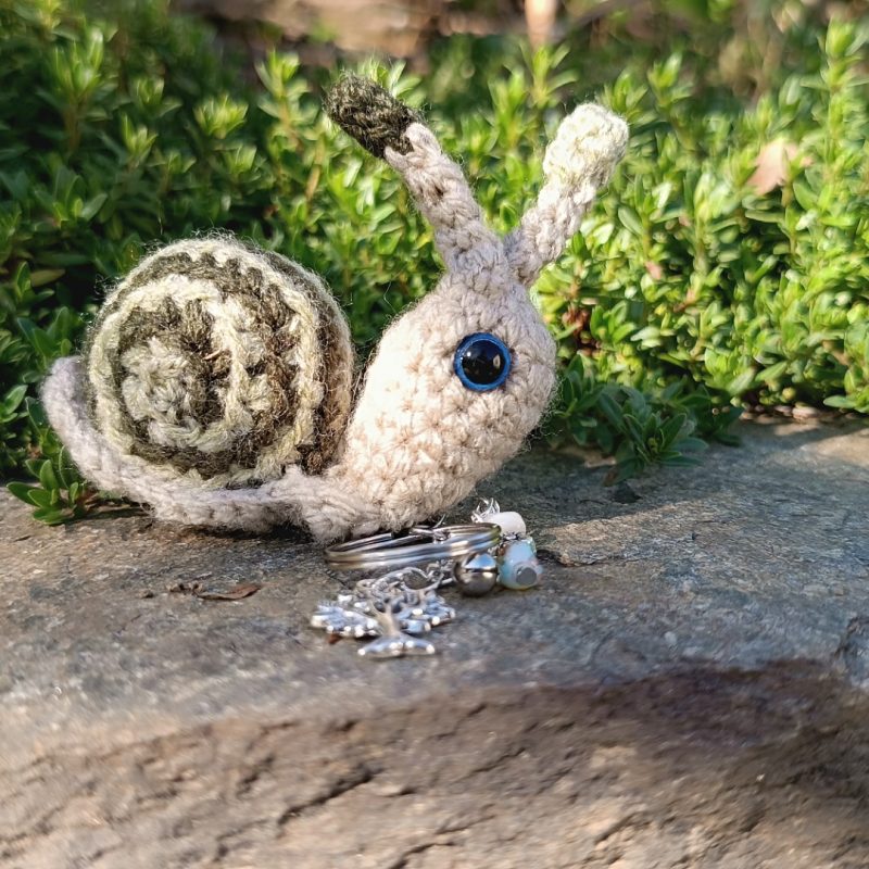 Amigurumi escargot à pampille , cagouille, caracole, porte-clé, marron et beige , crocheté main