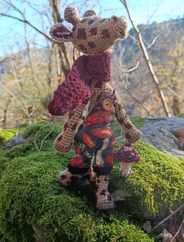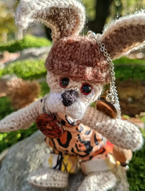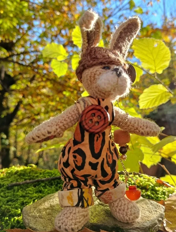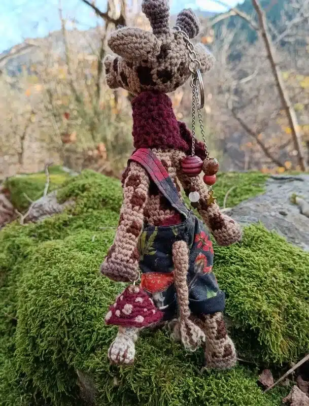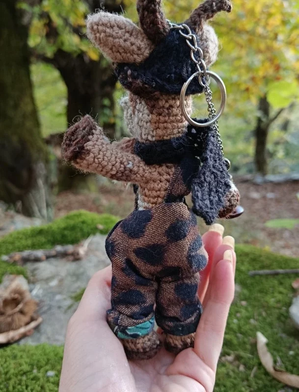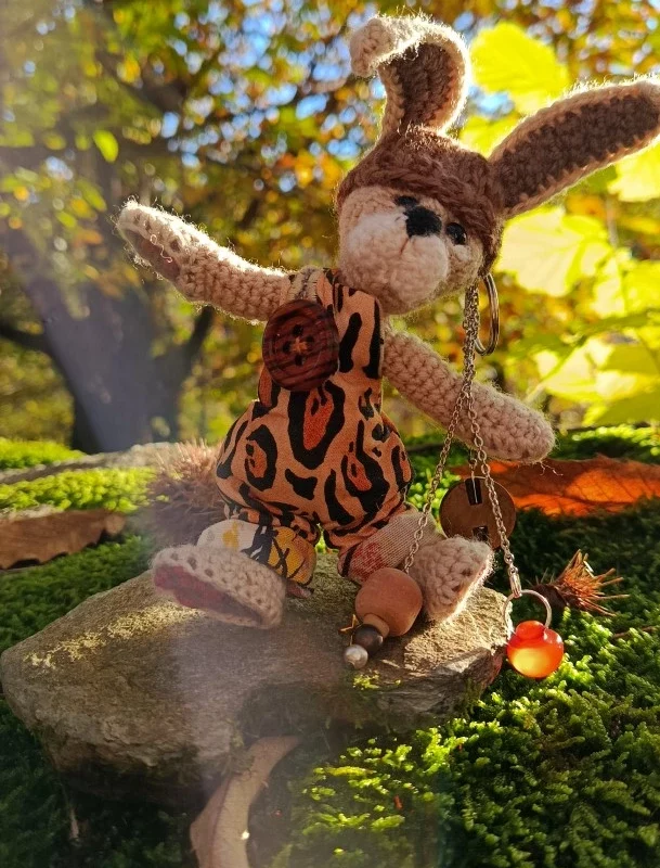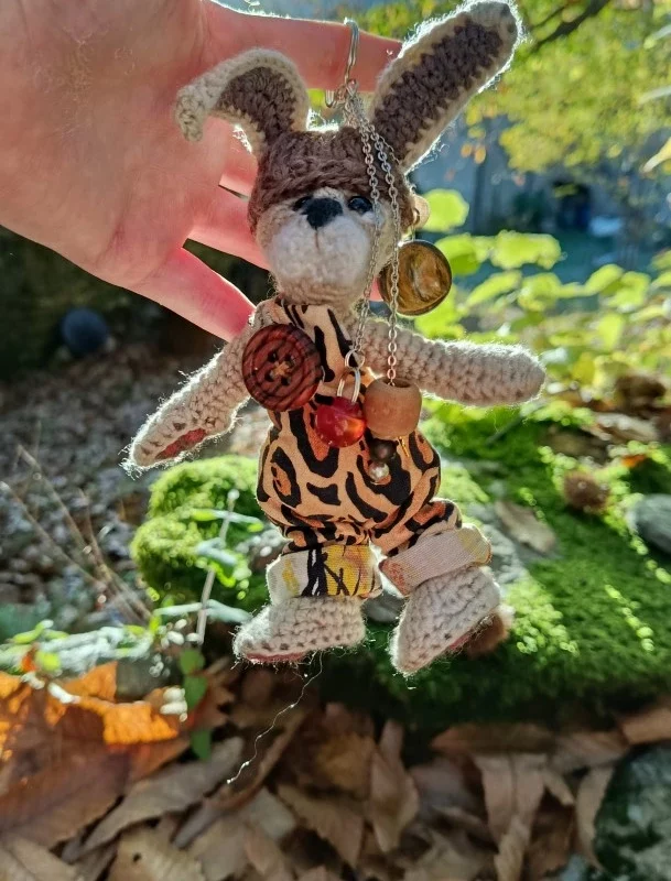 🗝️🐇 Les Porte-Clés (ou Talisman) qui conjurent les lapins posés et les clés envolées Hazel — le lièvre du noisetier, crocheté main, salopette léopard & bois naturel