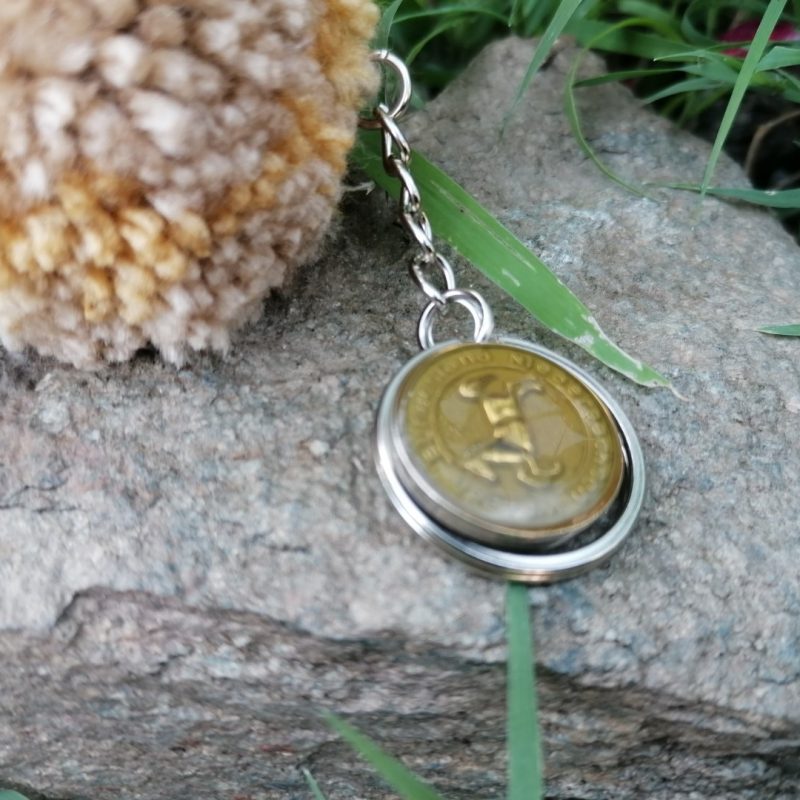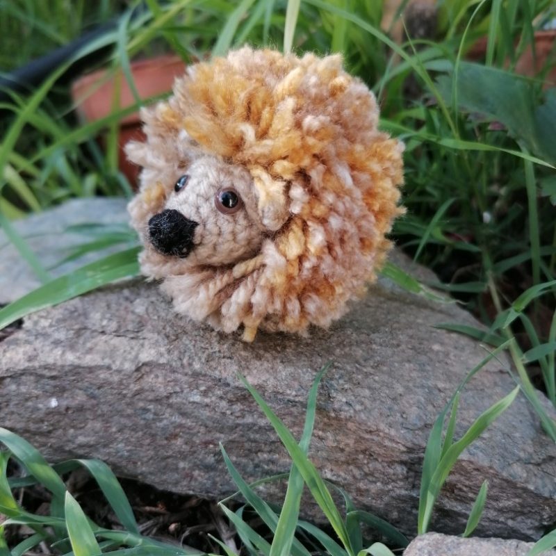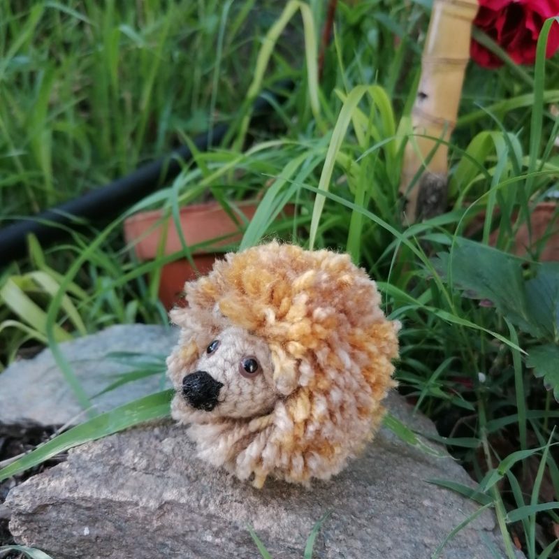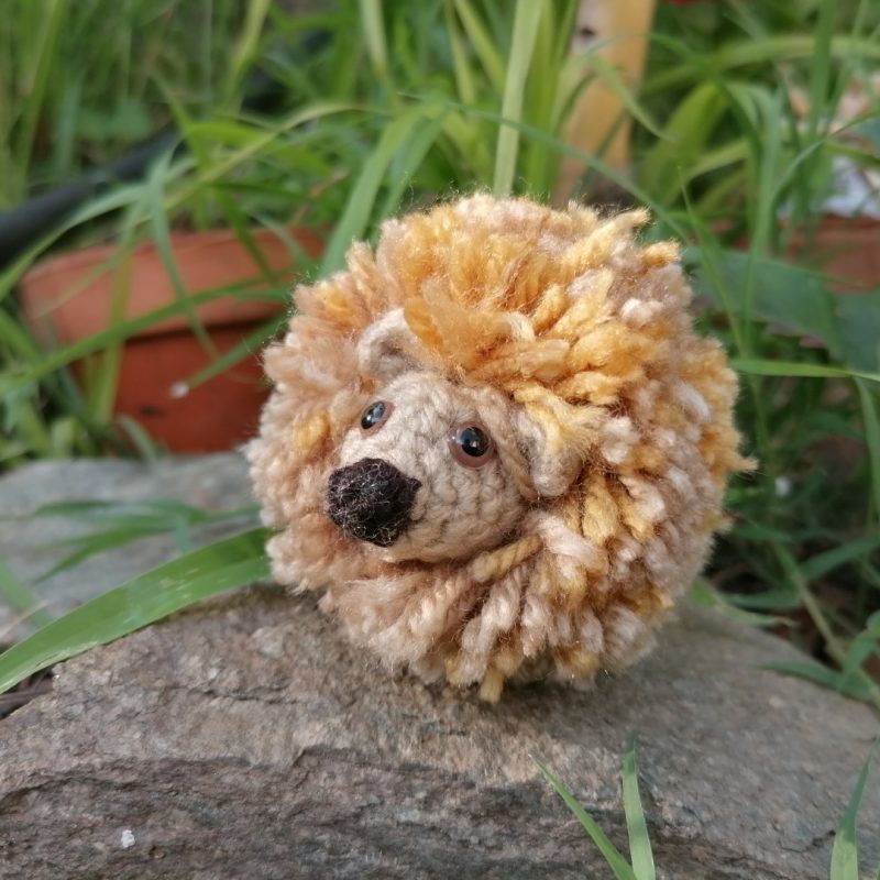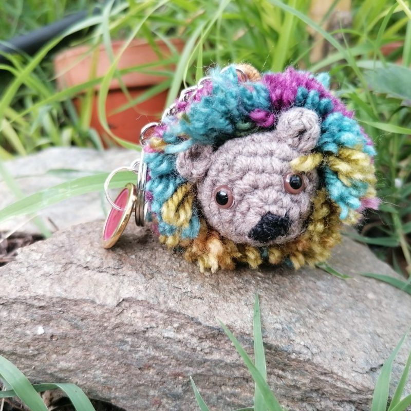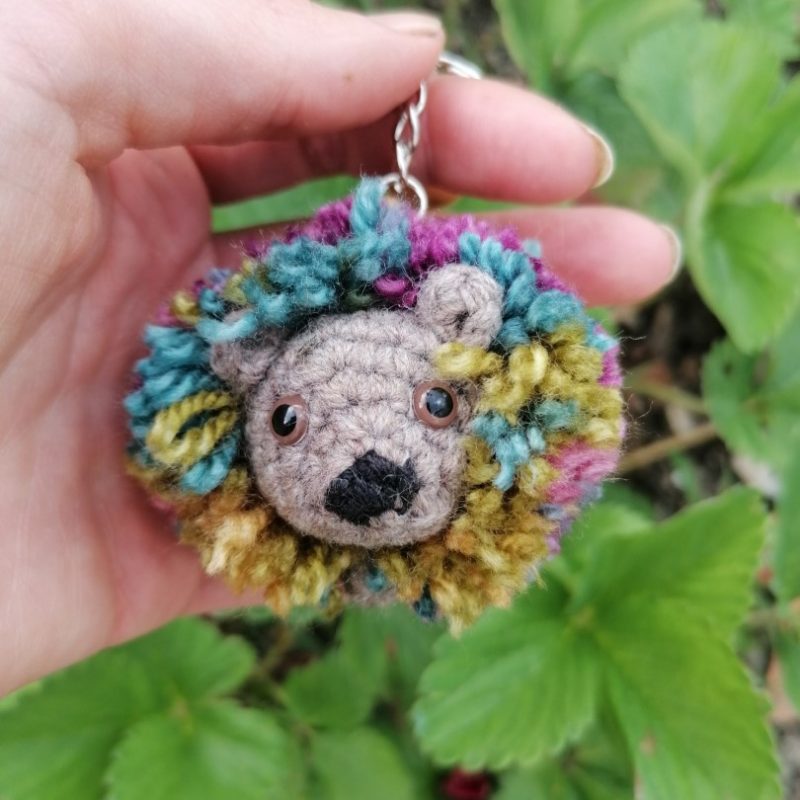 Amigurumi Porte-clés hérisson, gris à la crinière marron beige et jaune , et vieux bouton vintage doré, crochet et pom-pom