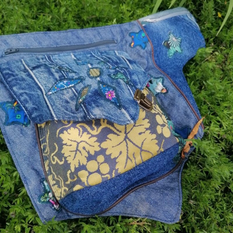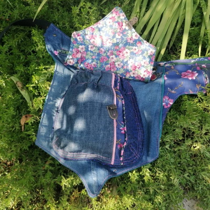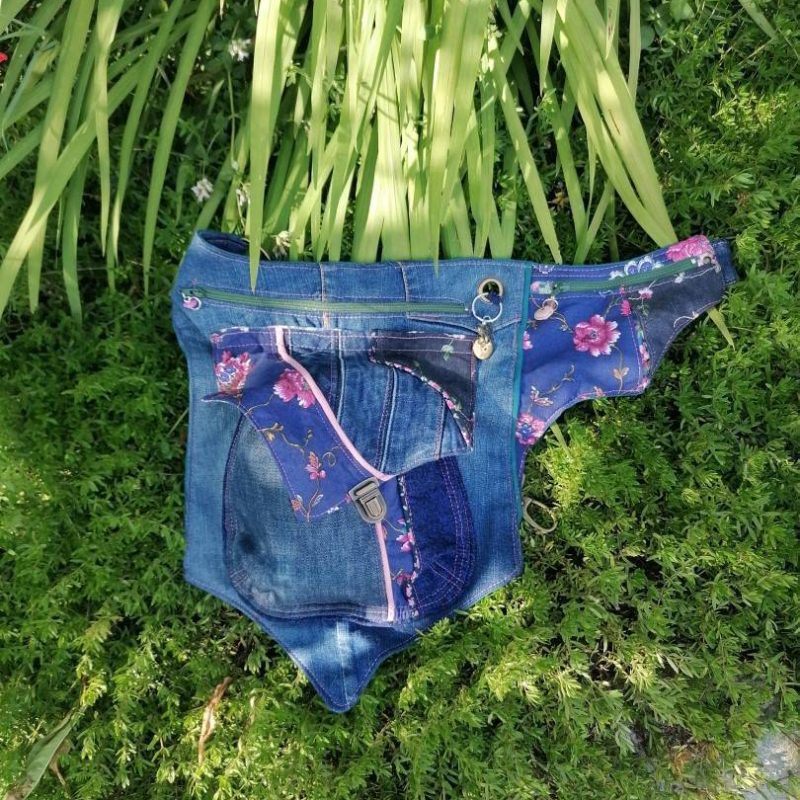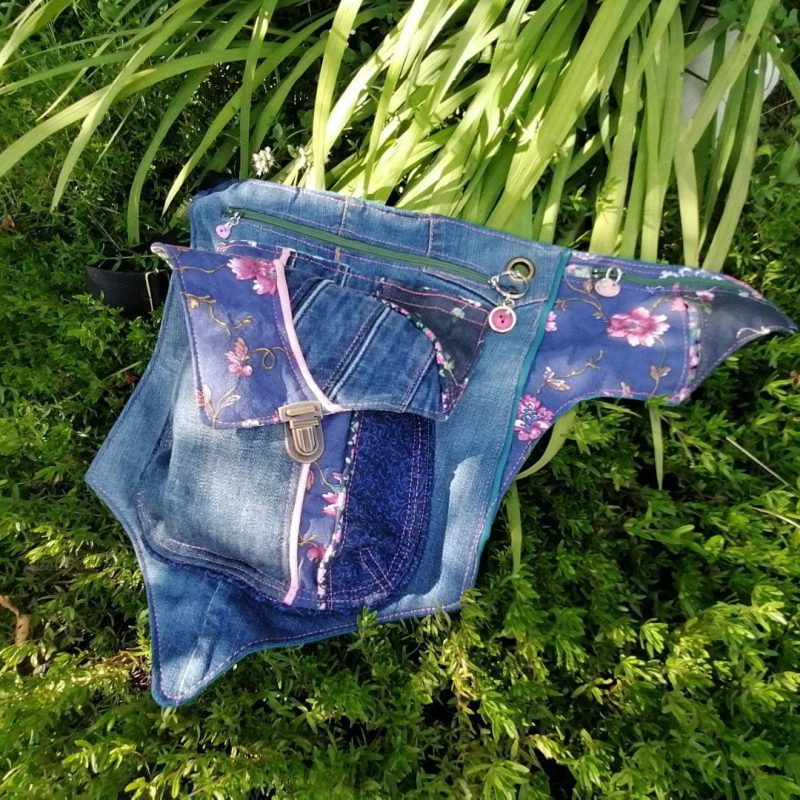 Sac ceinture, Ratapenada Édition « Bohemian dream flower pink & bleu jeans » , tissus d’ameublements jeans, cotons