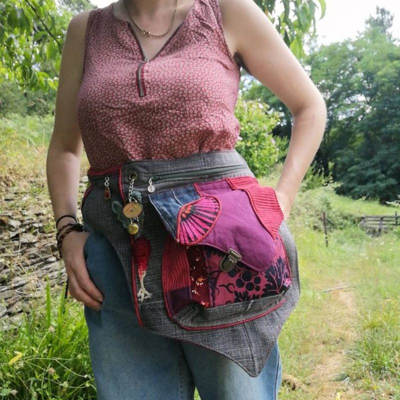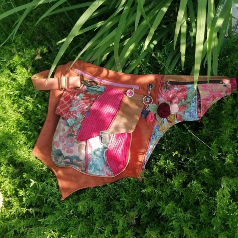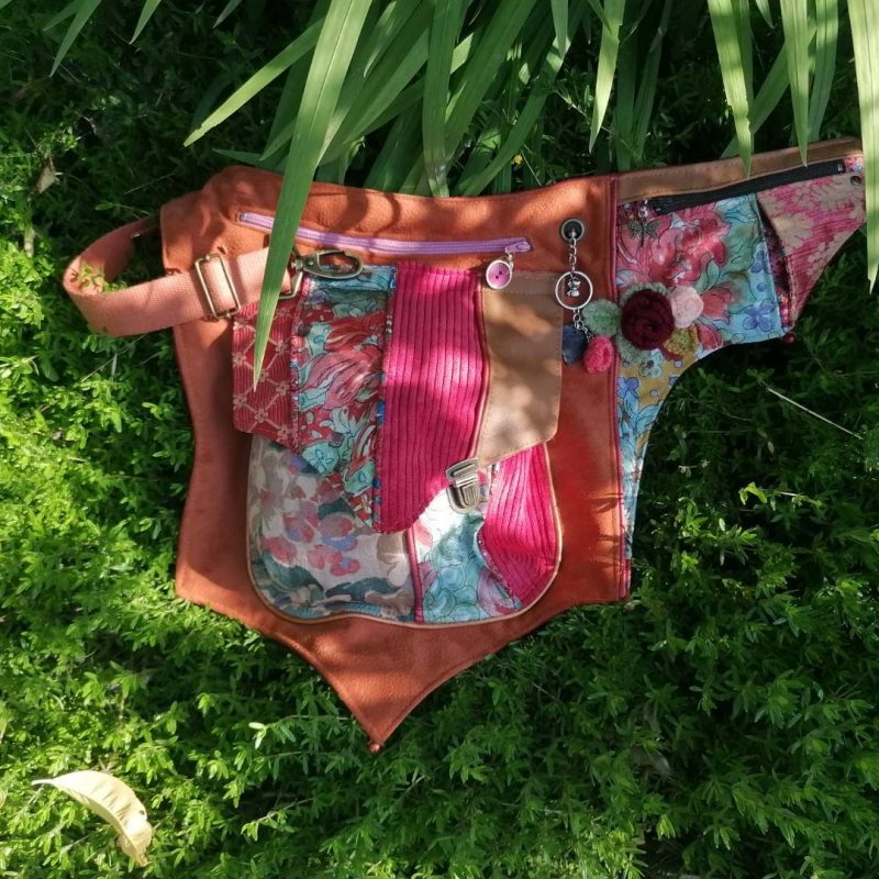 Sac ceinture, Ratapenada « free woodstock pink colore », tissus vintage, coton, simili velours..