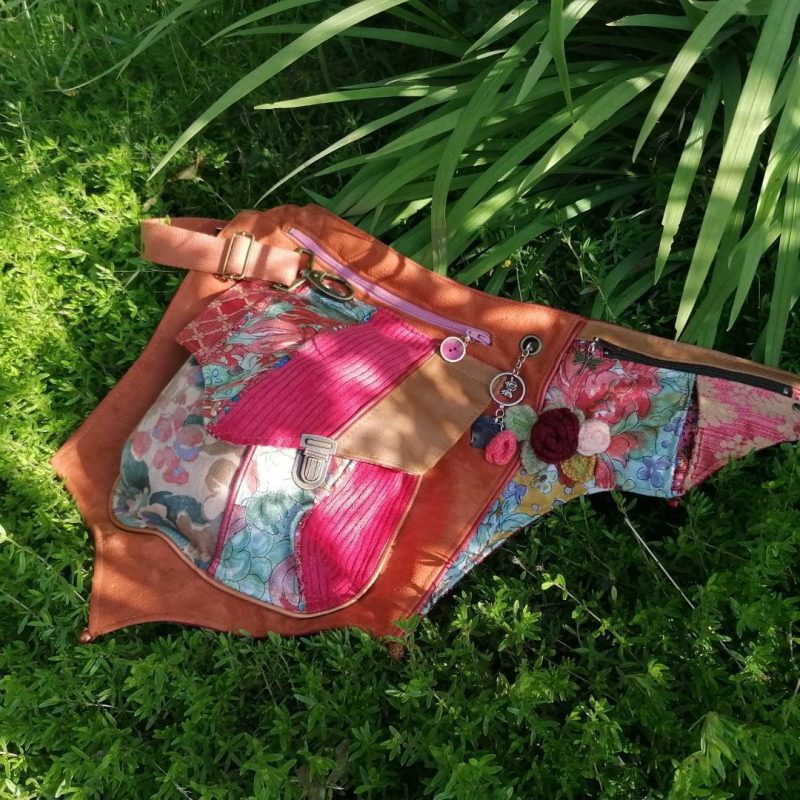 Sac ceinture, Ratapenada Édition « Flowers pink hippies rustique », nubuck, tissus d’ameublement et cotons