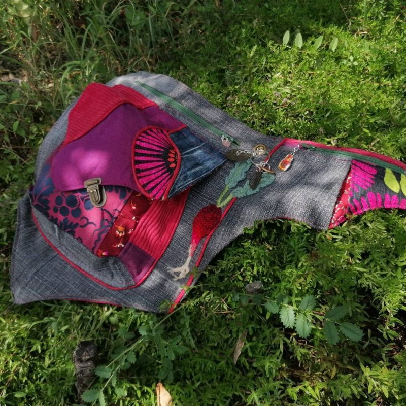 Sac ceinture, Ratapenada « “Sous les Spores, le Secret” », tissus vintage, coton, simili velours…