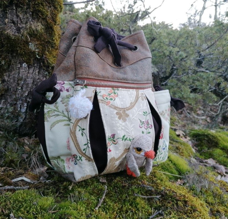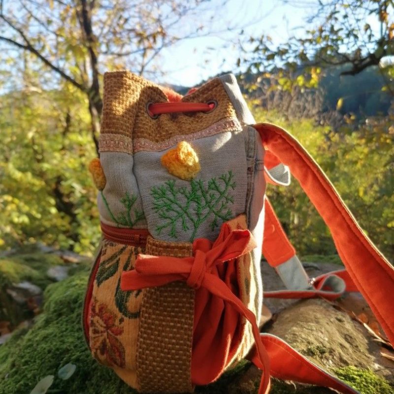 Sac à dos, « Lanterne », »Chouette perchée sur un lit de Douceur fleuris dans les roches schisteuse », simili, cotons, et tissus tapissier