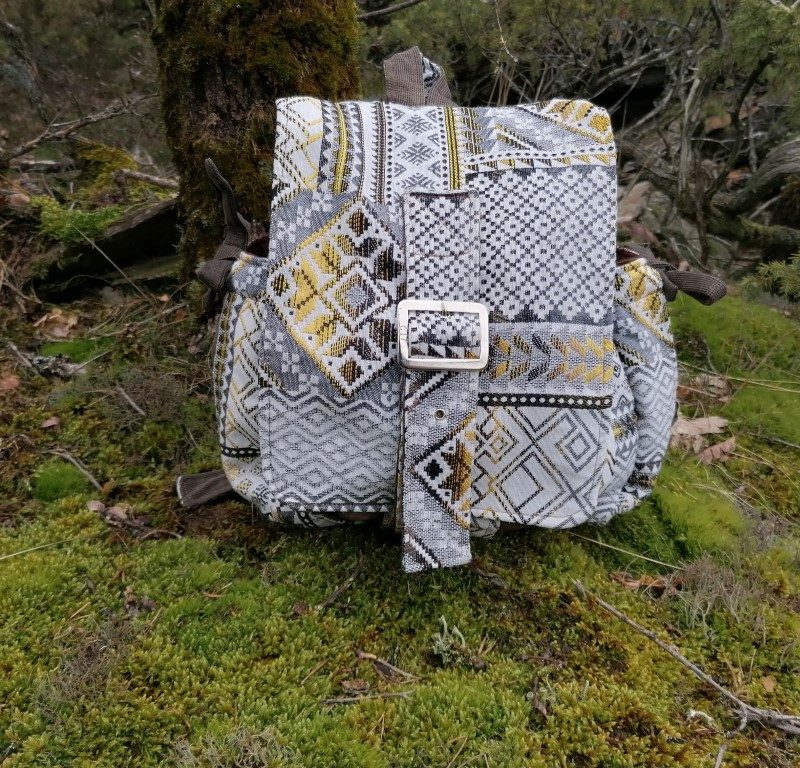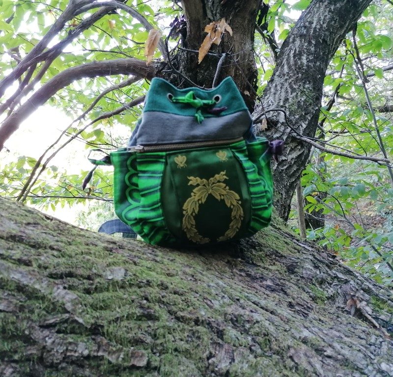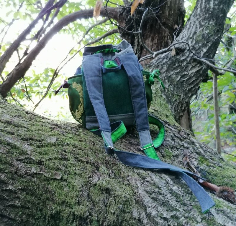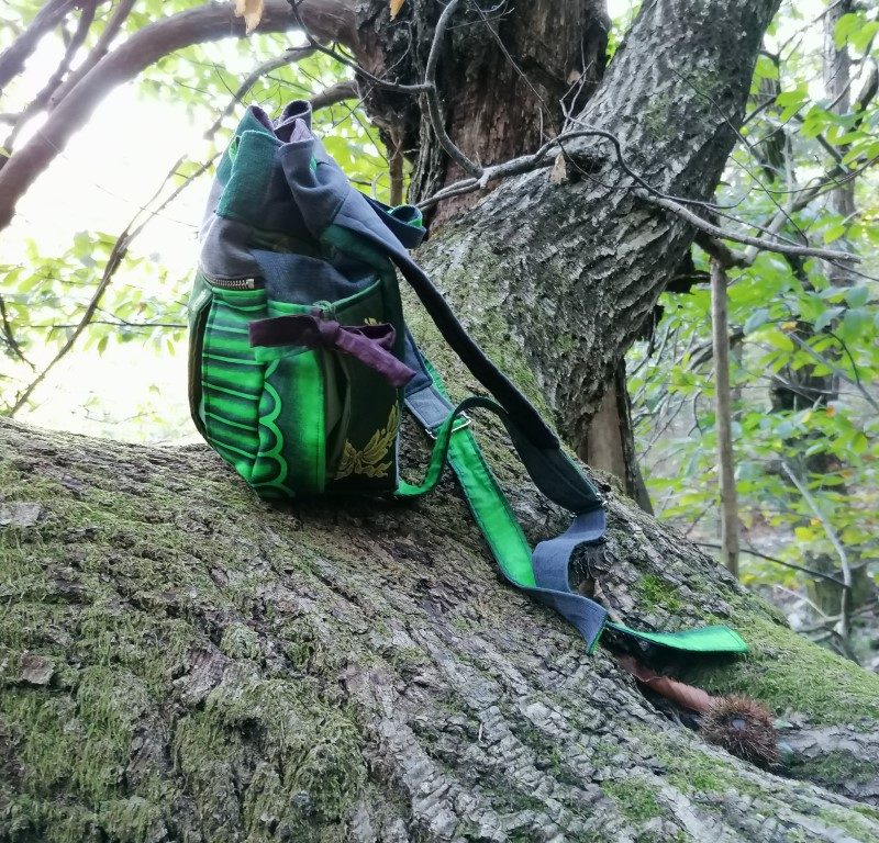 Sac à dos , « lanternes », « Émeraudes des temps », tissus de tapissier, wax coton et jeans, taille moyenne