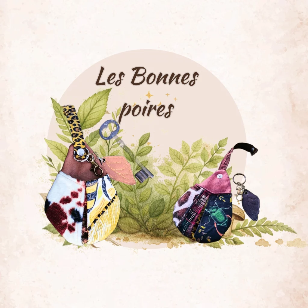 Etui à clefs, grosse, La Bonne poire aux clefs ferme son clapet, « Simone .. », jean, coton, dentelle tissus d’ameublement