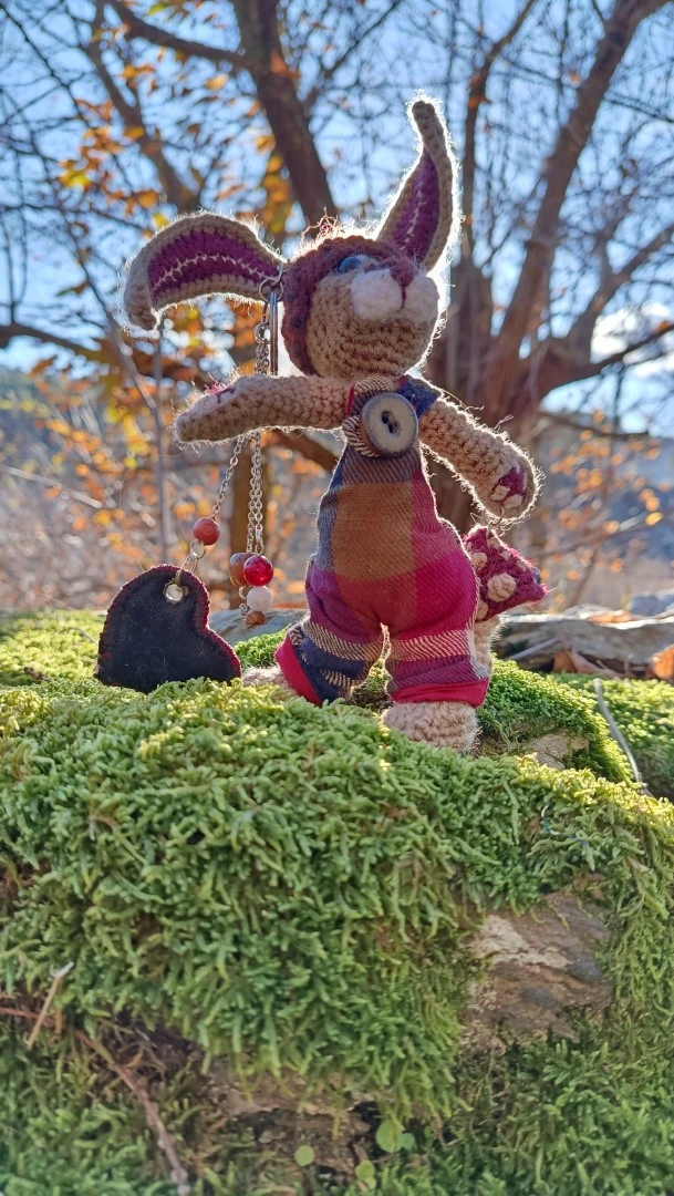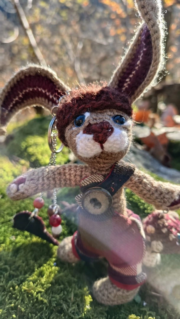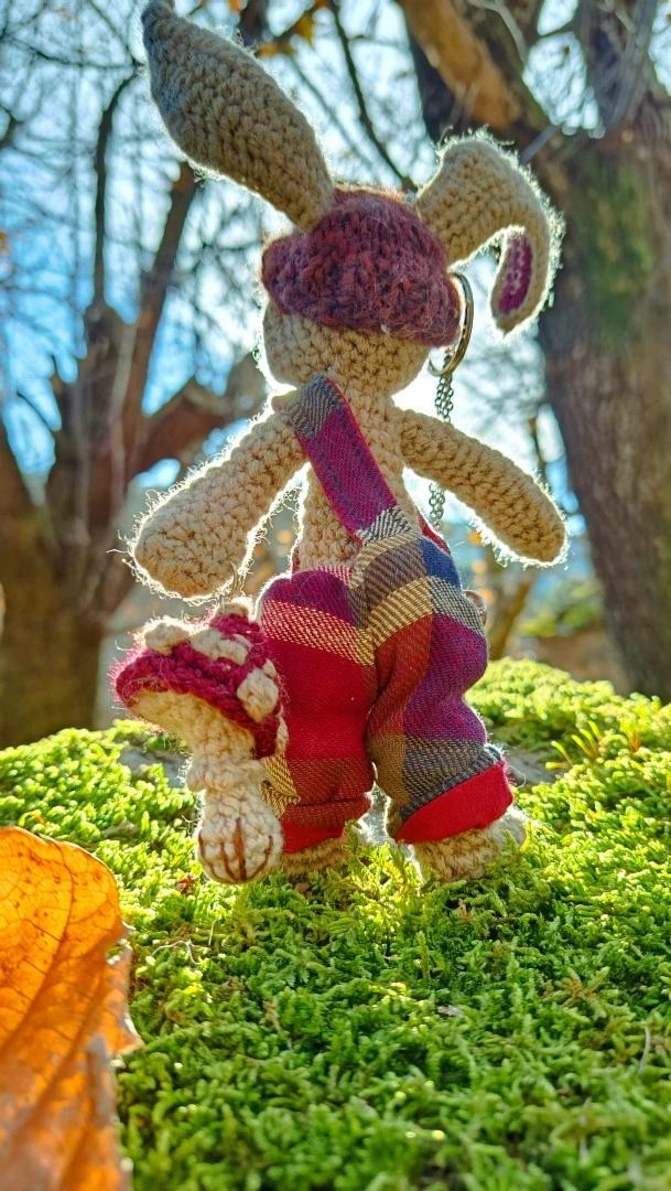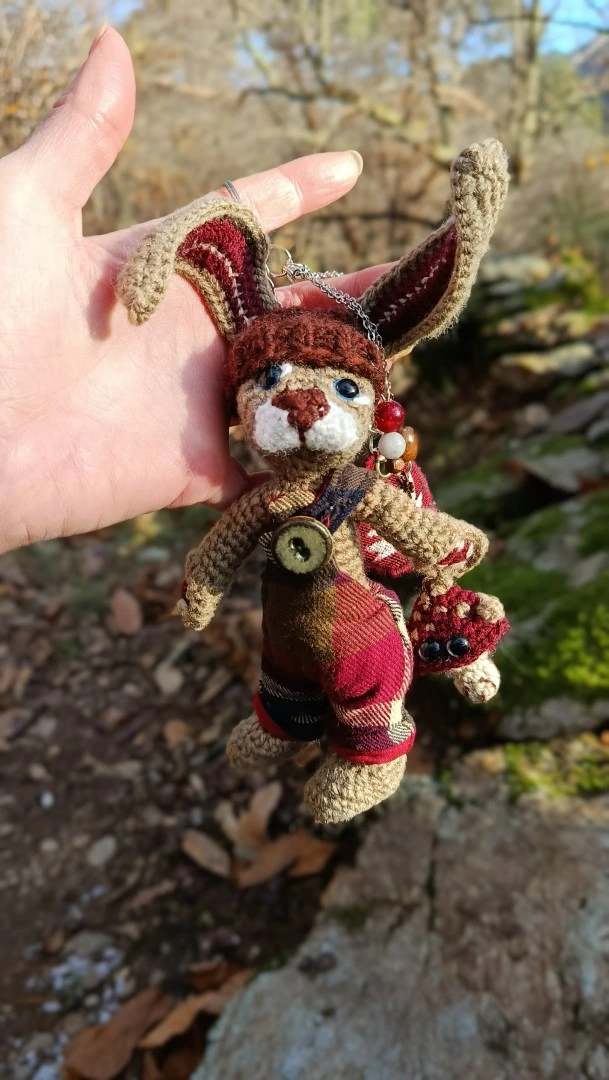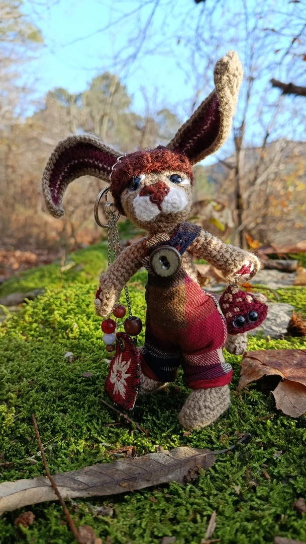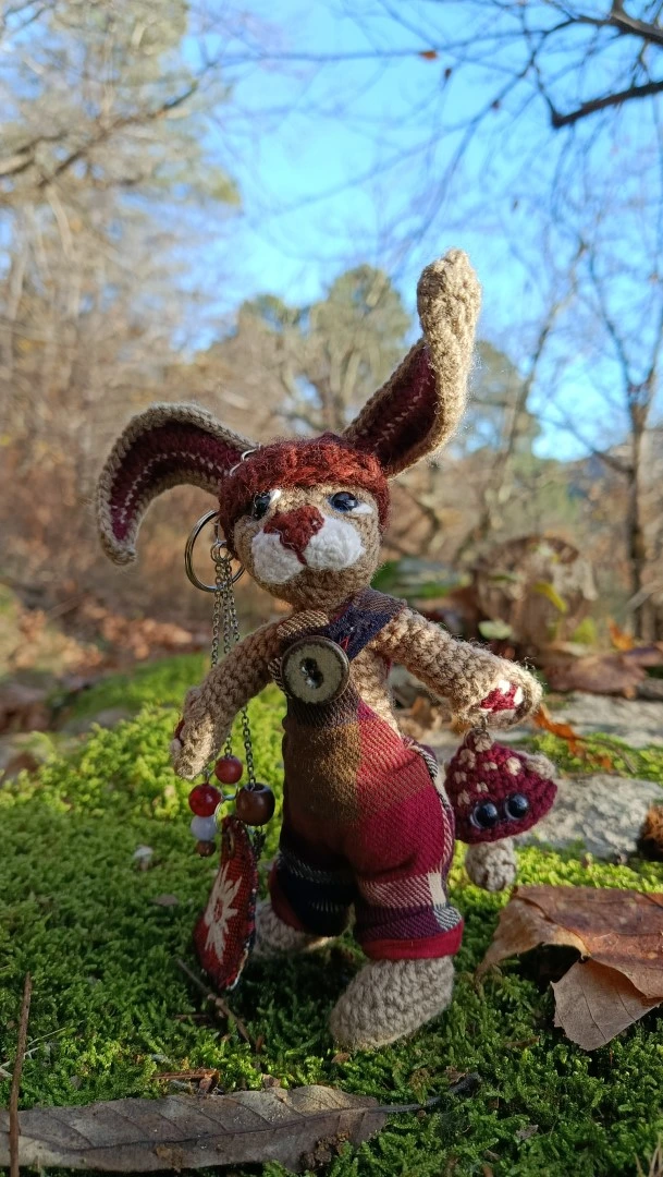 🗝️🐇 Les Porte-Clés (ou Talisman) qui conjurent les lapins posés et les clés envolées ROWAN — le lièvre sylvestre Gardien des passages et des poches rêveuses, crocheté main, salopette Tartan & bouton en grès