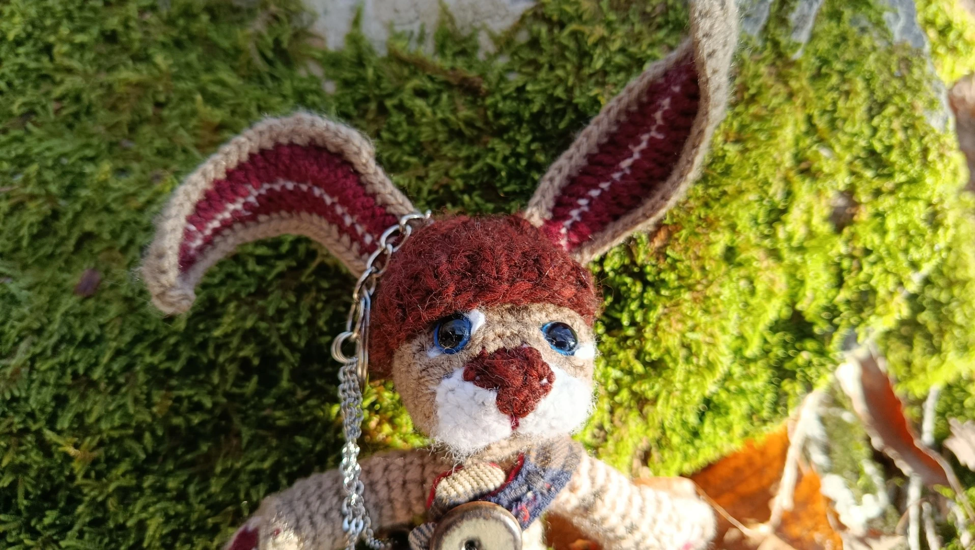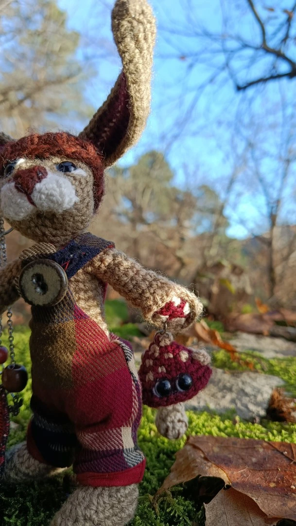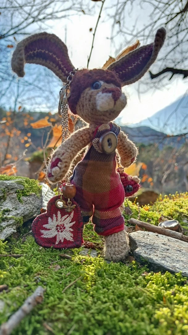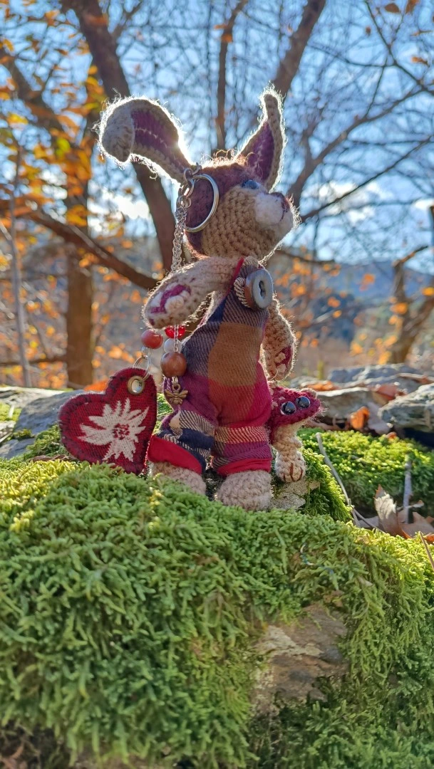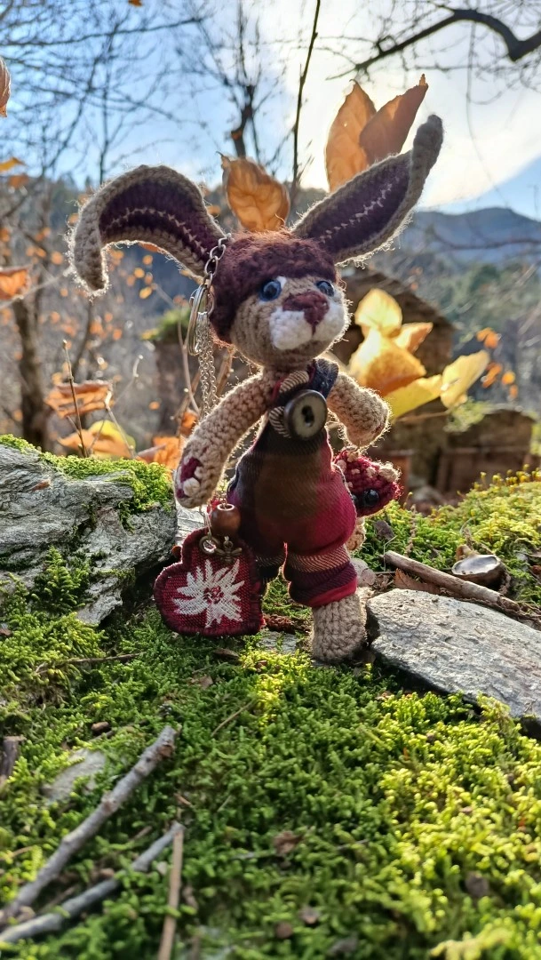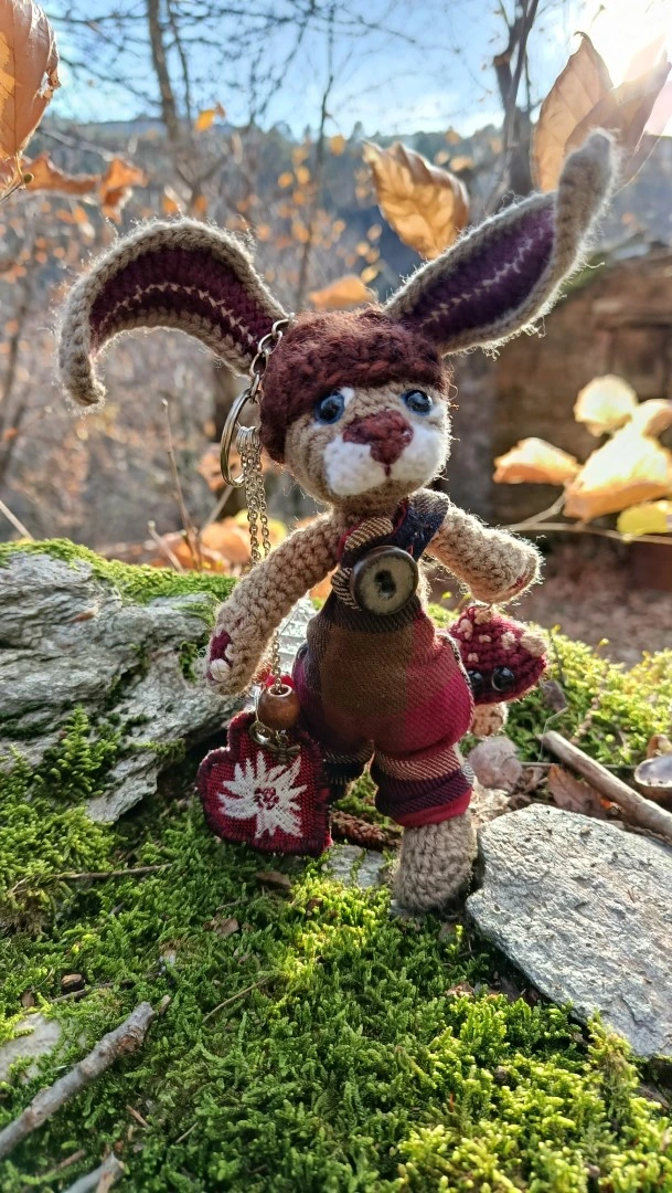 🗝️🐇 Les Porte-Clés (ou Talisman) qui conjurent les lapins posés et les clés envolées ROWAN — le lièvre sylvestre Gardien des passages et des poches rêveuses, crocheté main, salopette Tartan & bouton en grès