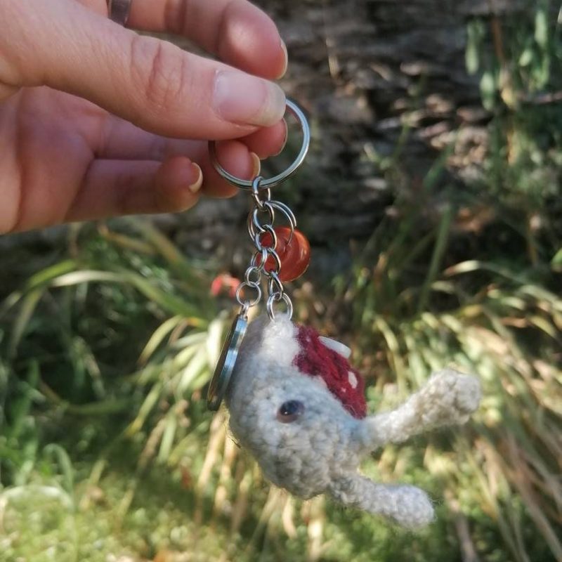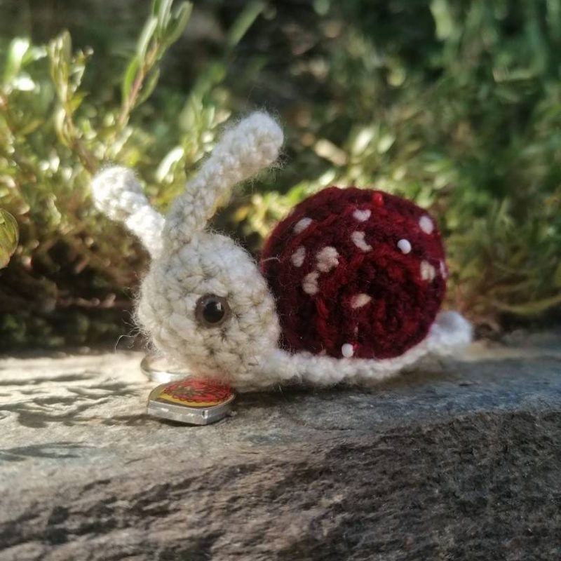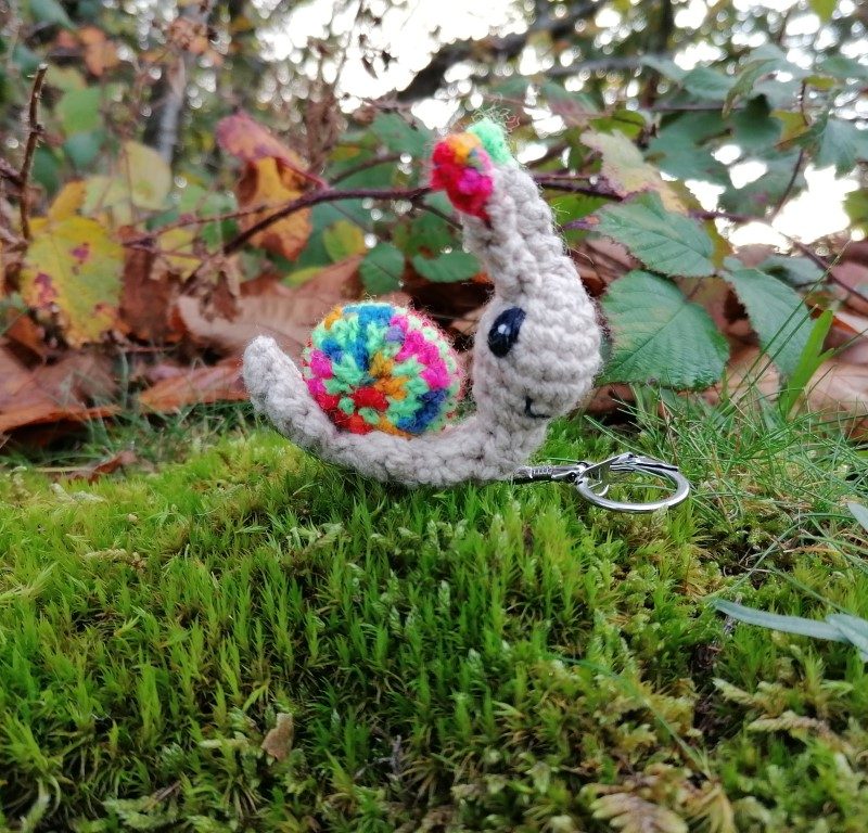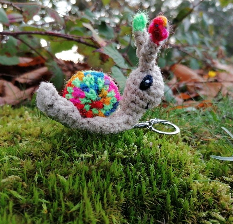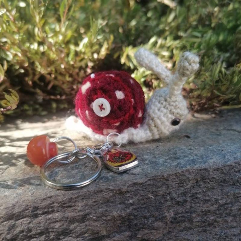 Amigurumi escargot, cagouille, caracole , porte-clés, avec sa maison toute arc-en-ciel et rouge, n6