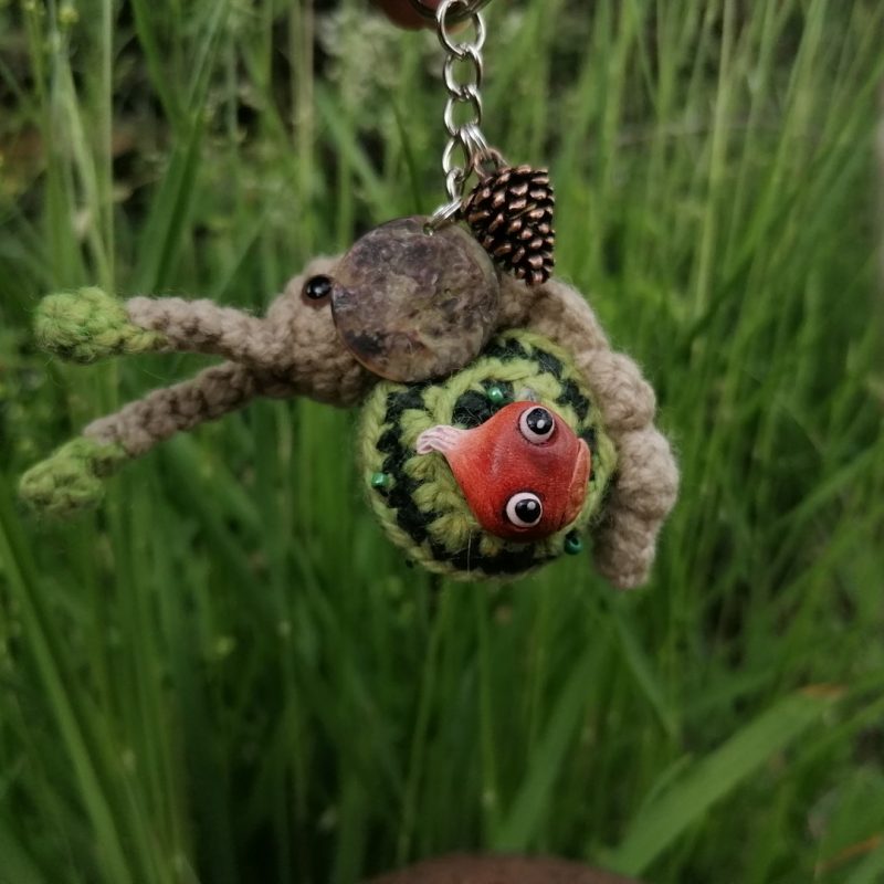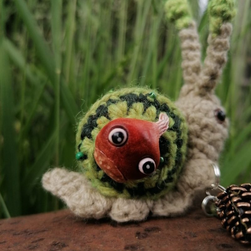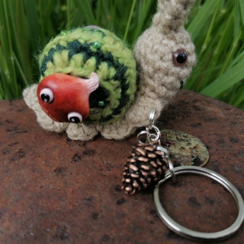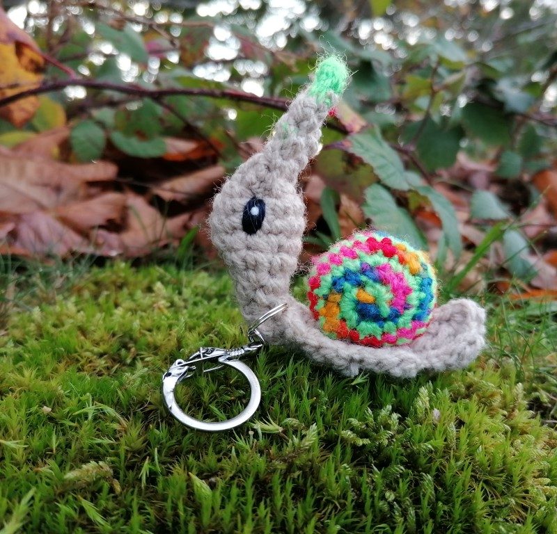 Monsieur escargot , version porte-clefs, avec sa maison toute colorée aux couleurs de l’arc-en-ciel et rouge.