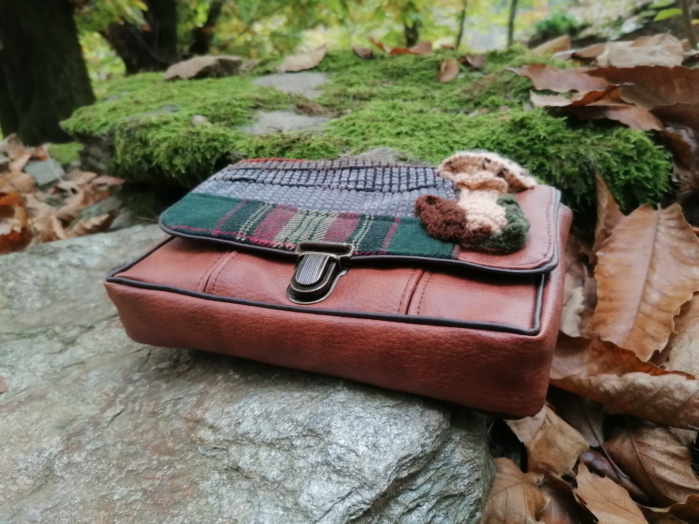 Castagne, pochette , »Tribal d’automne » ,motif coulemelle au crochet, tissus d’ameublement , coton, simili, passe poils…