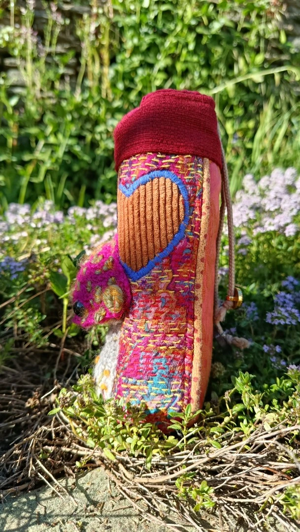 - L’Ancrage Terrestre (Résilience) : Du jean brut upcyclé (votre denim adoré, avec ses coutures zigzag rouges, tel un pouls nerveux, symbole du chemin de vie que l’on trace avec patience). C’est la force de l’aidante, le feu intérieur pour affronter le quotidien.