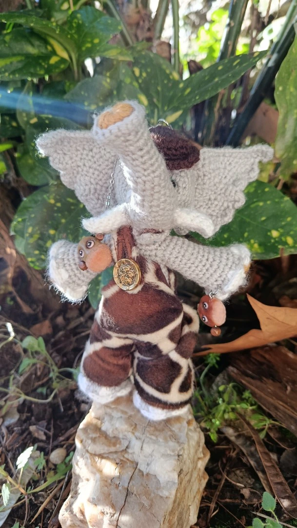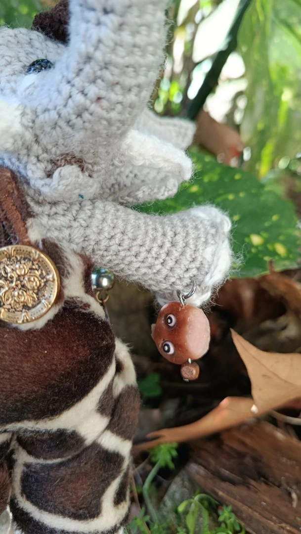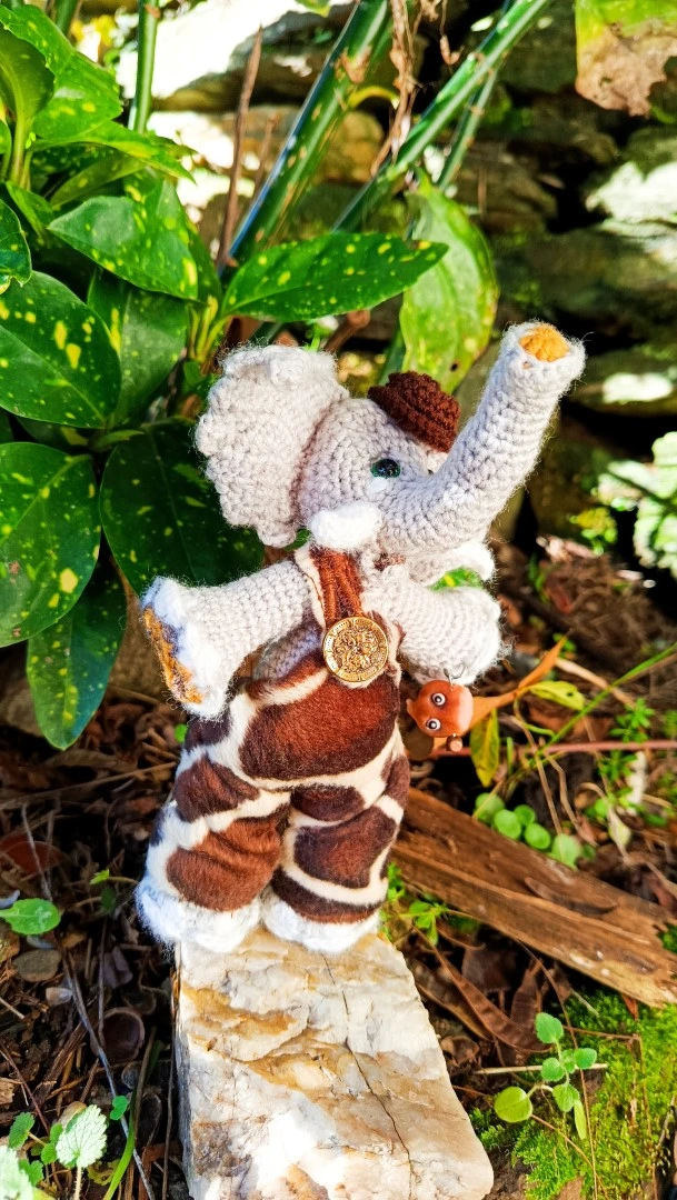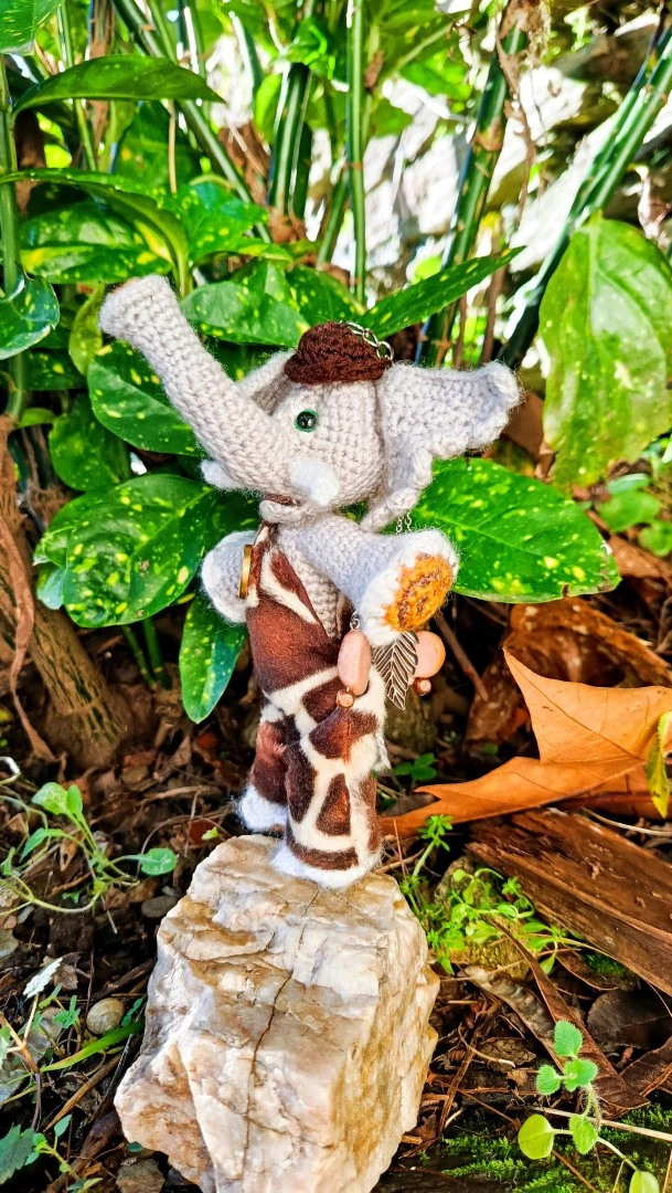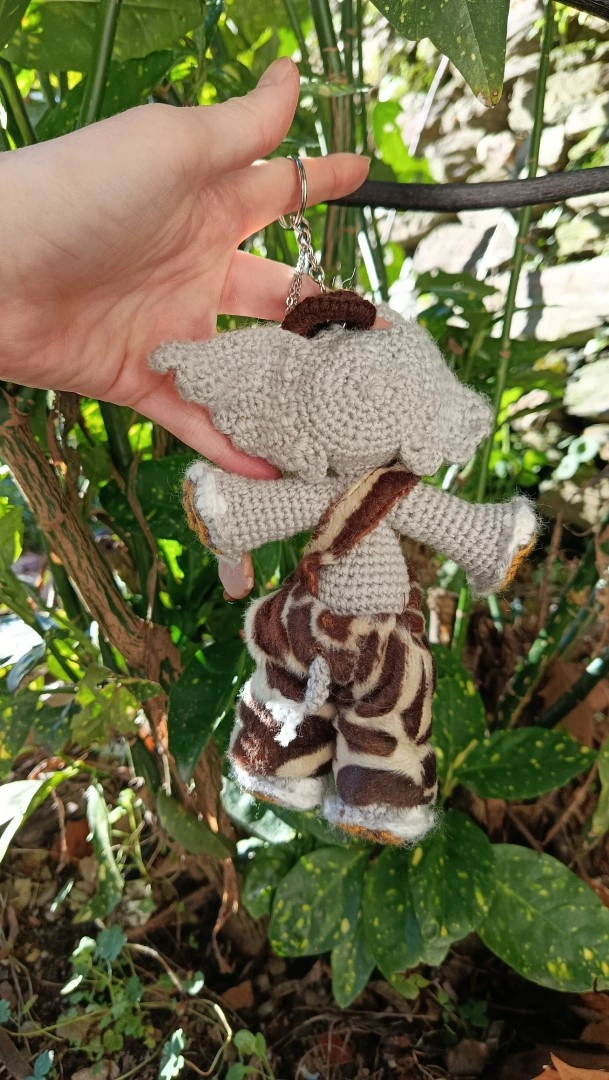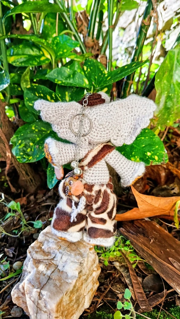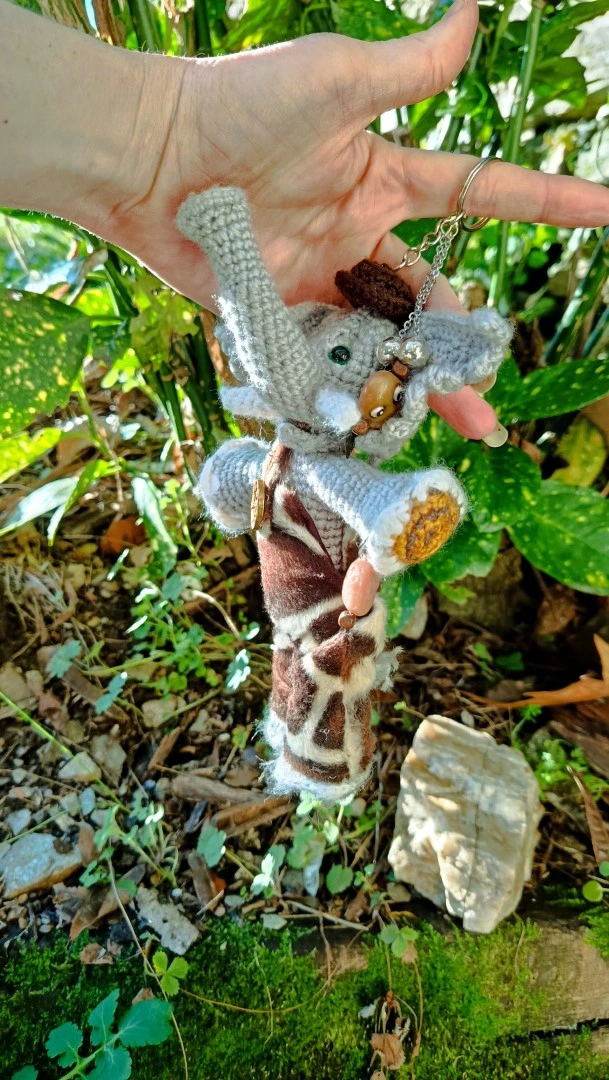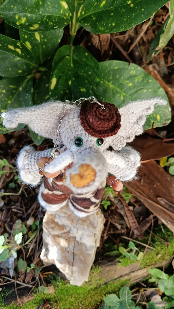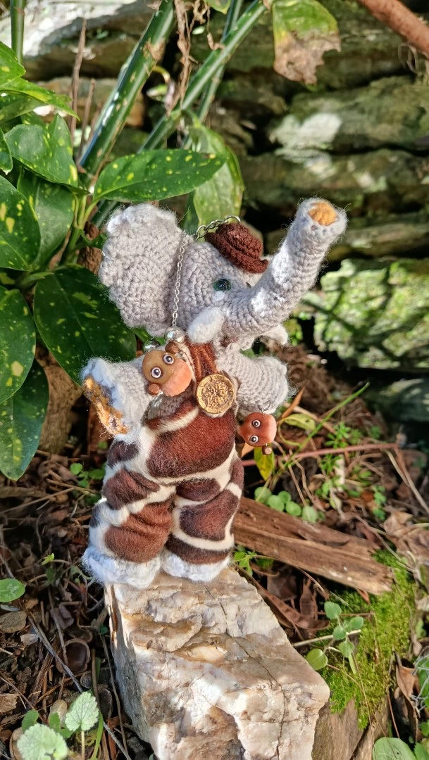 Le Porte-Clés (ou Talismans) des Souvenirs Sauvages Nesto — l’éléphant des rencontres qui restent – crochetée à la main, acrylique, poly-cotons , boutons apprêt