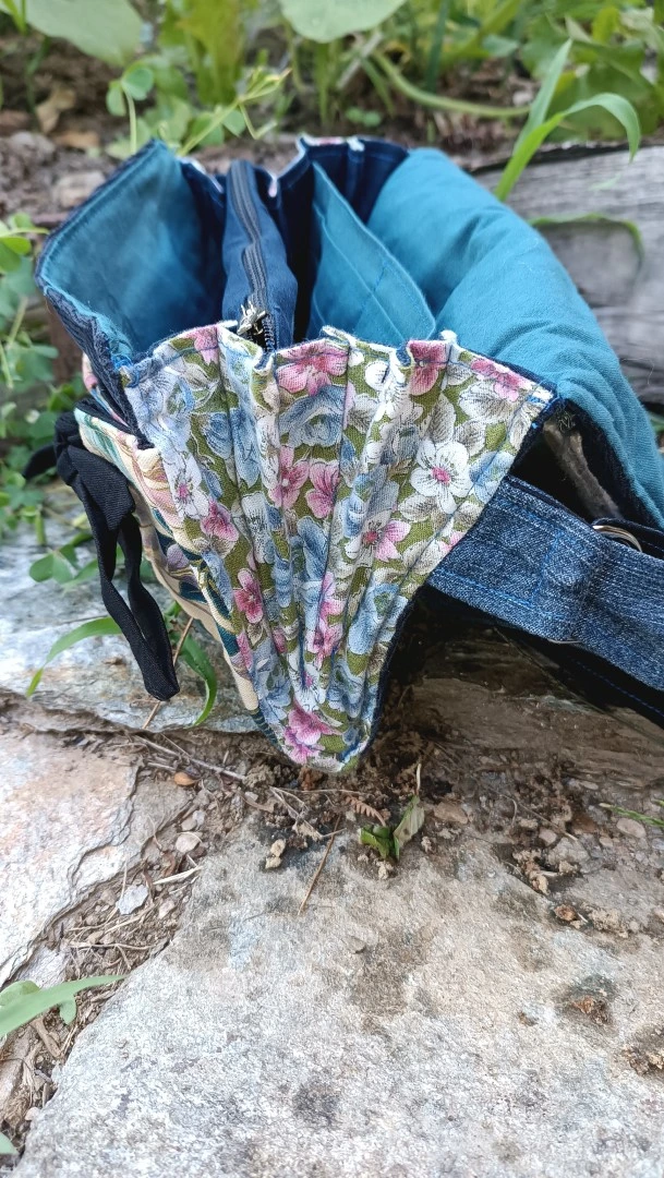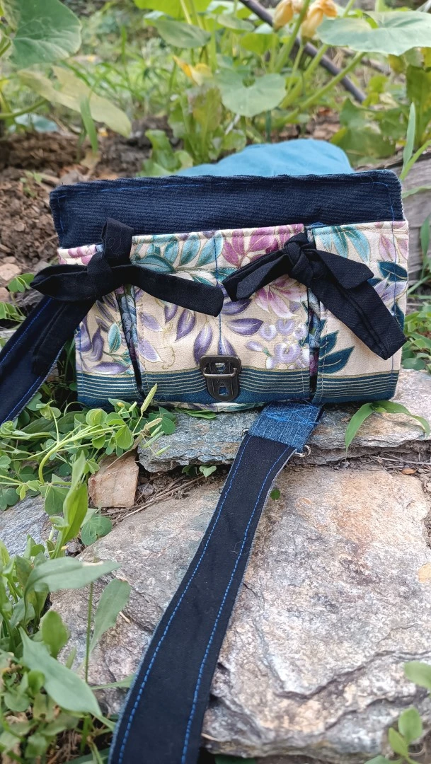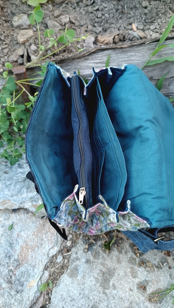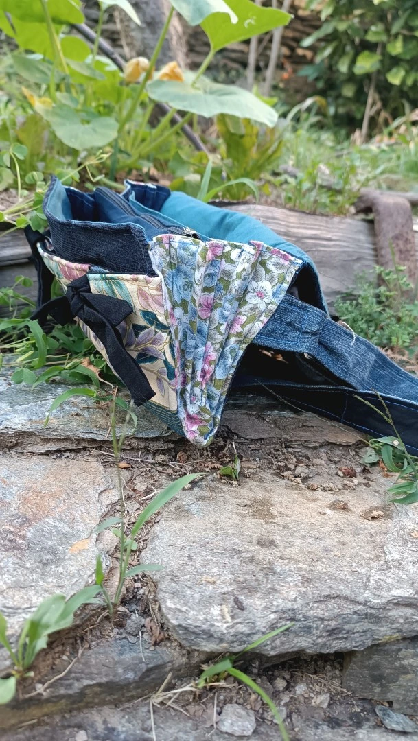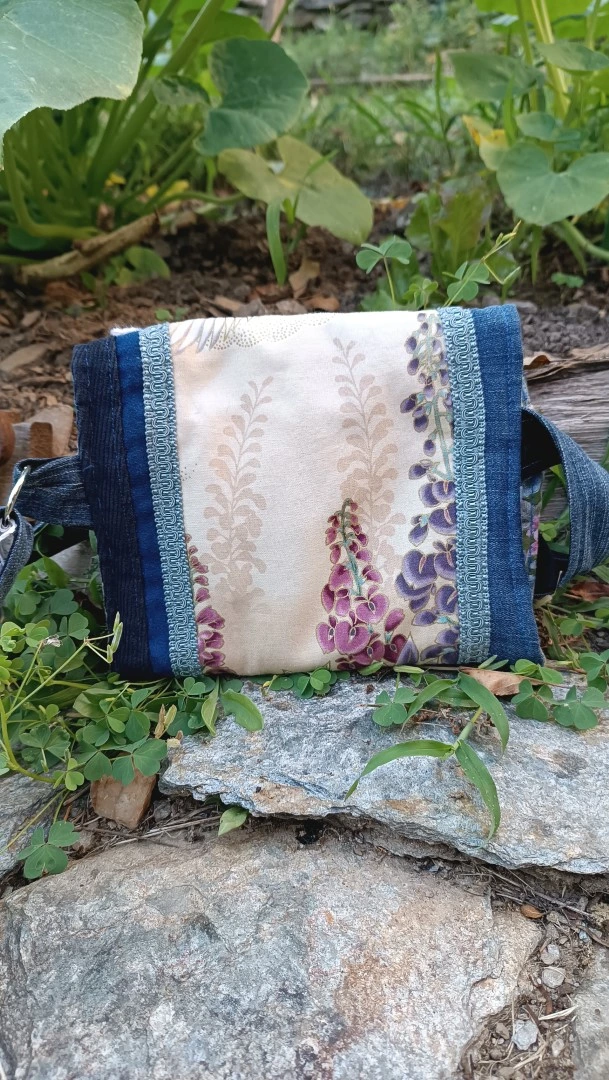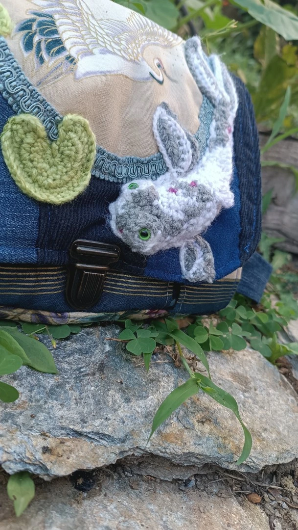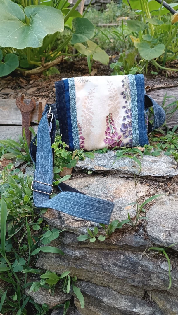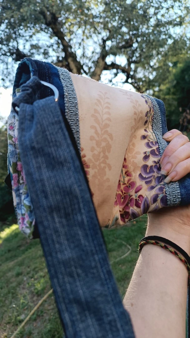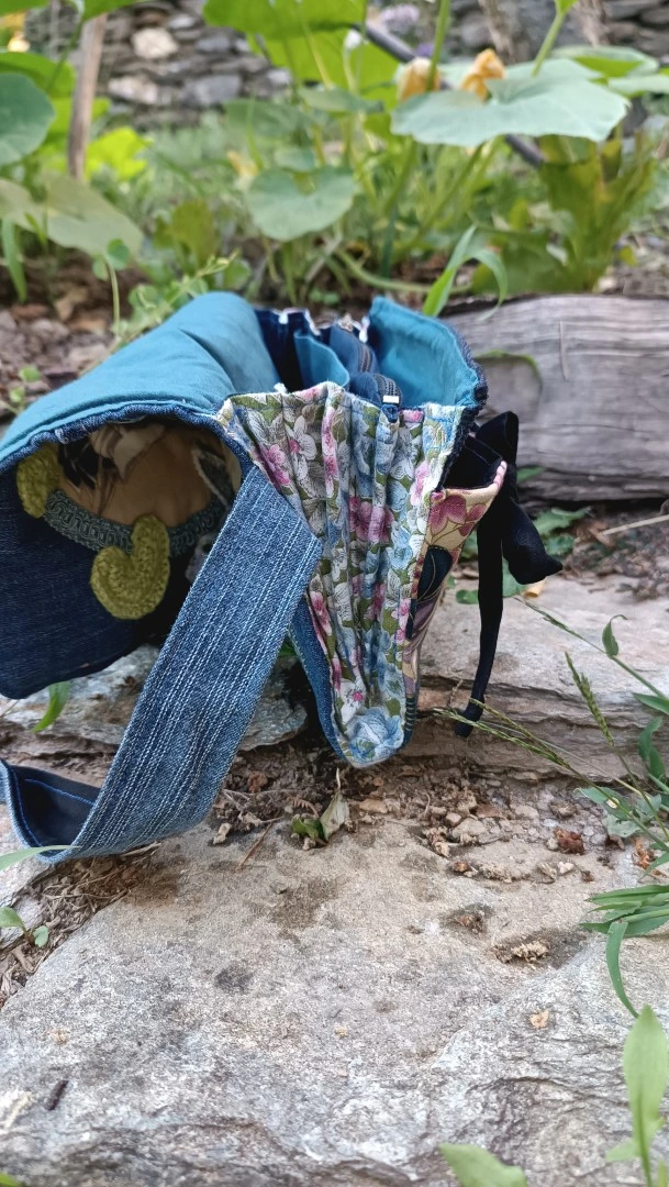 Cousue à partir de jean upcyclé et de coton imprimé, agrémentée de détails poétiques (appliqués, broderies, crochet).