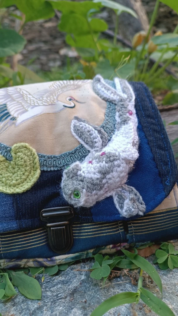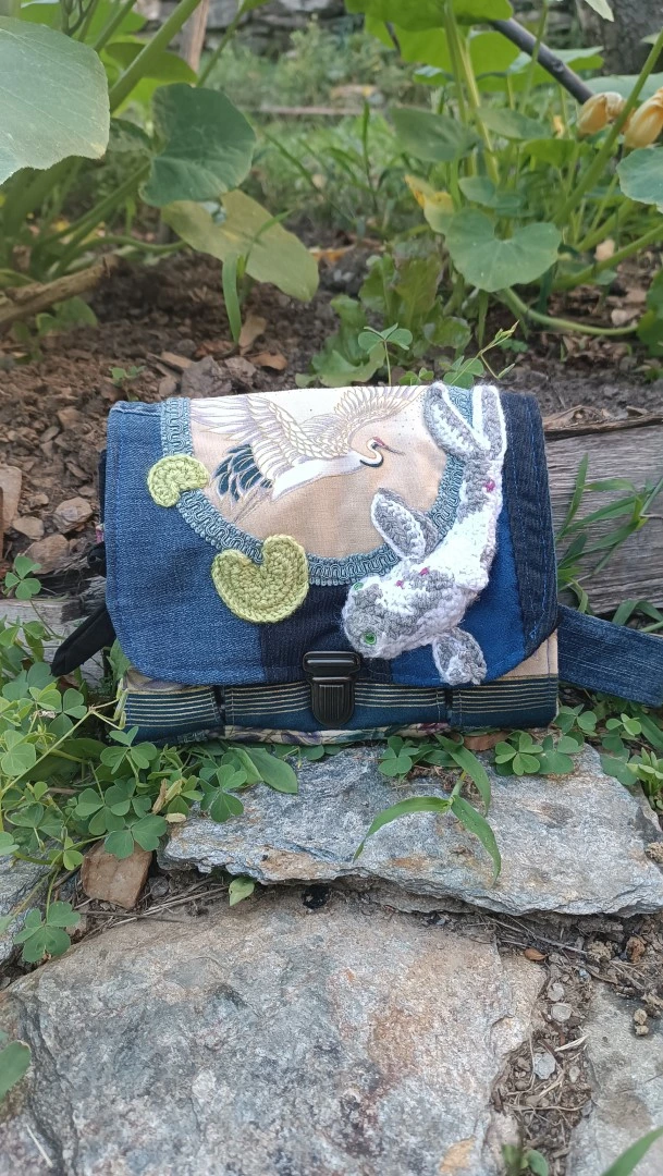 Petit sac bandoulière, « Soufflette » « Carpe Koï & Jardin Bohème », jeans et coton , motif au crochet en 3D
