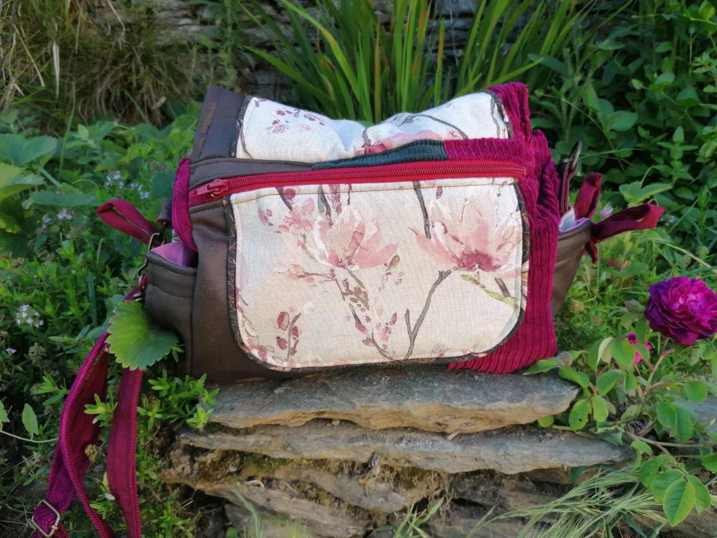 Un passepoil tout mignon s’installe aussi pour donner un peut plus de rusticité aux teintes clair rosées de ce magnifique coton , imprimé magnolia.