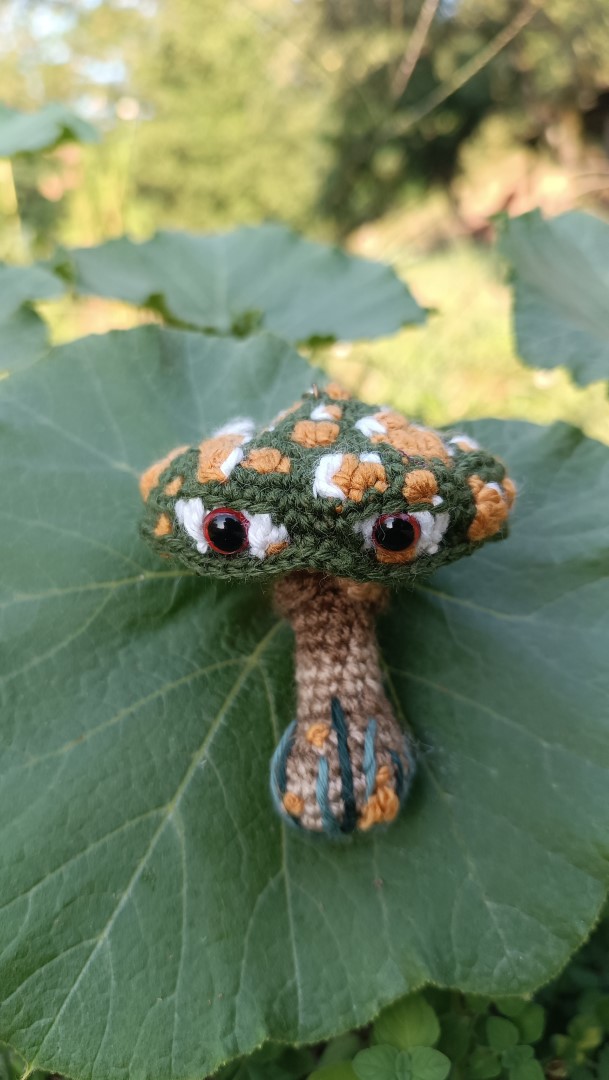 - Couleurs : Chapeau vert avec des spores jaune & blanc, pied beige et gris avec des détails brodés.