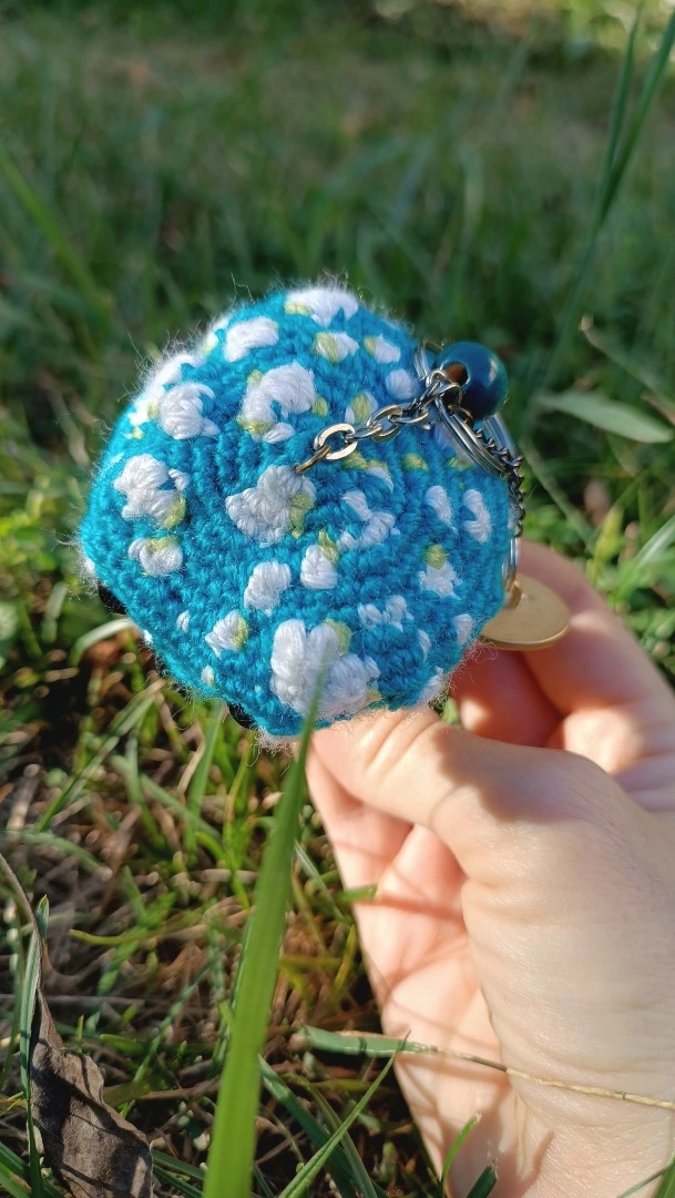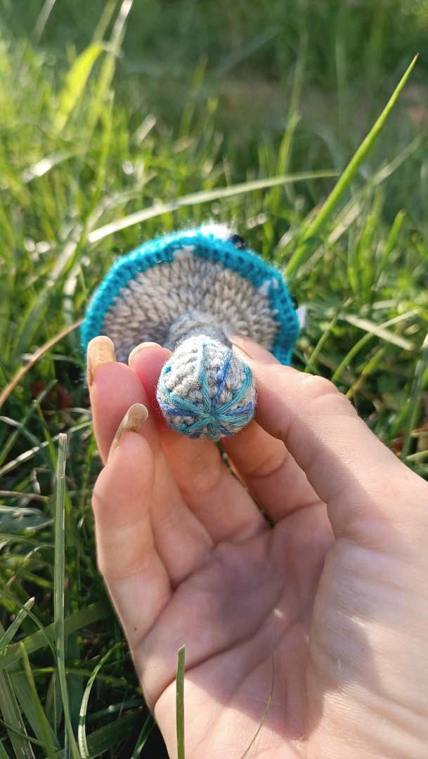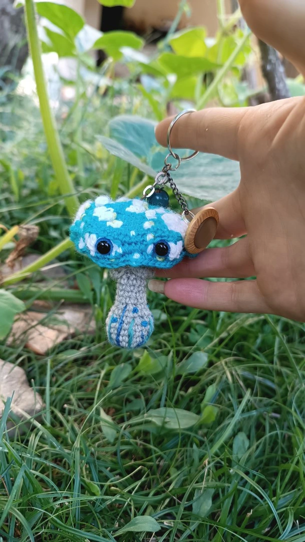 Voici une jolie Amanite au bleu cyan et blanc vert sporifique, une pièce unique crochetée à la main, prête à prendre place parmi vos clés. Inspiré par les champignons et la chanson culte