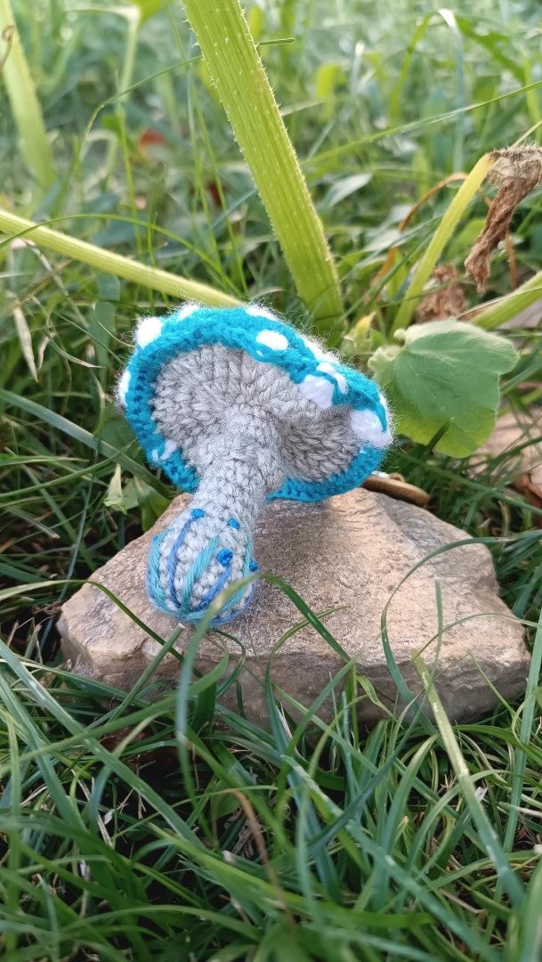 - Couleurs : Chapeau bleu cyan avec des spores blanc et vert, pied gris avec des détails brodés.