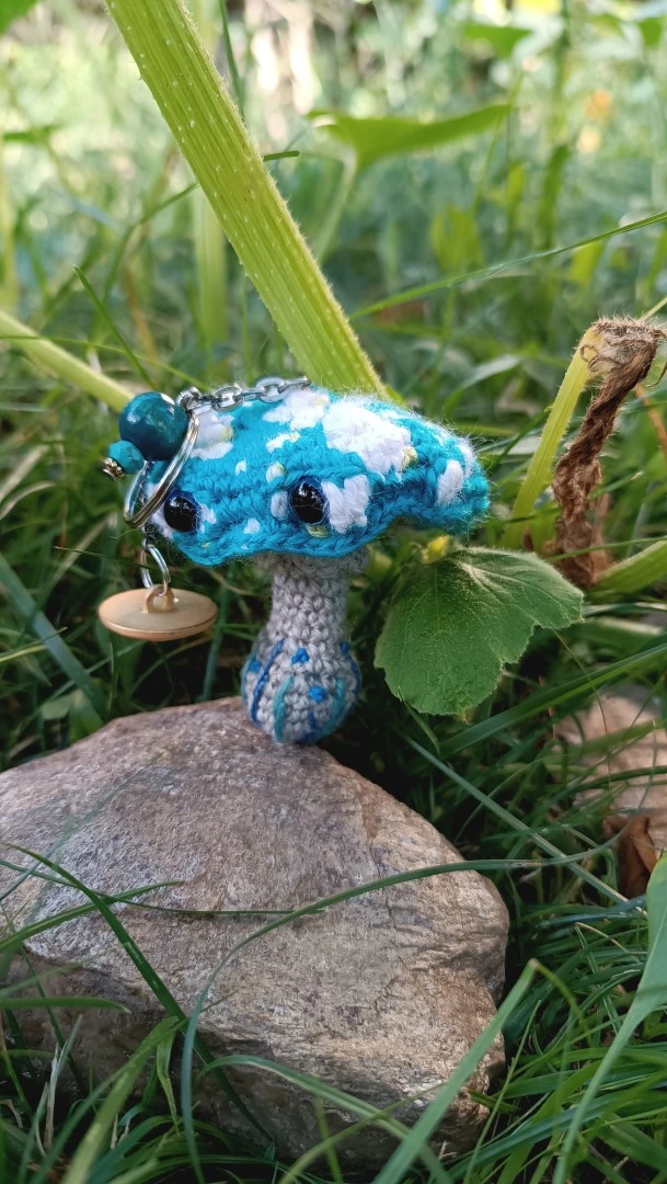 Porte-clés , champignon , Champi’fou Bleu cyan aux spores blanc et vert psychédélique, crocheté main acrylique, ouate hypoallergénique