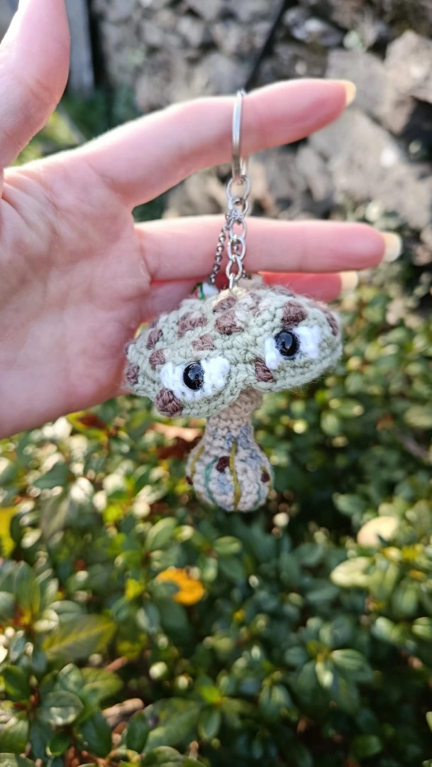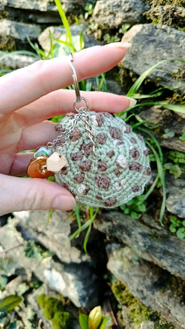 Porte-clés , champignon , Champi’fou vert d’eau aux spores taupe psychédélique, crocheté main acrylique, ouate hypoallergénique