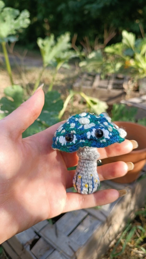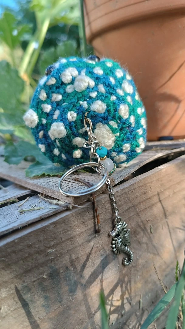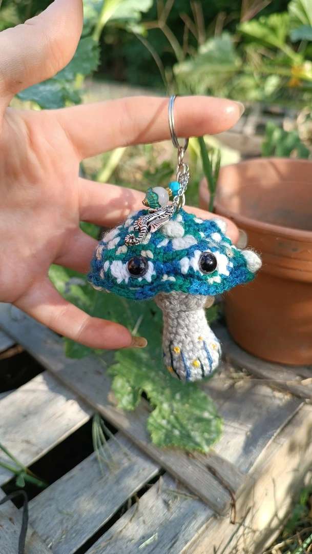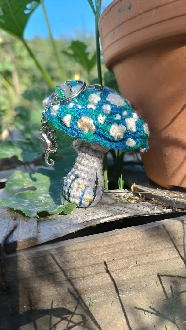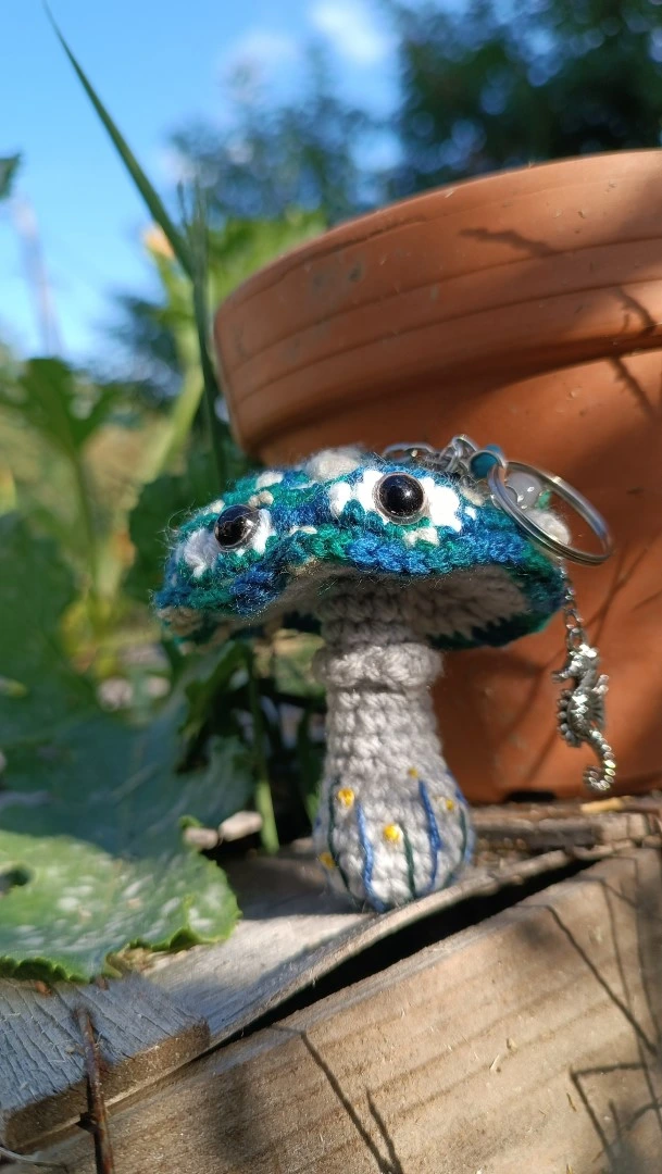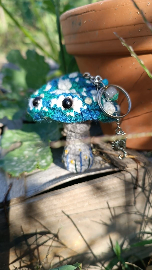 Porte-clés , champignon , Champi’fou bleu vert aux spores blanc et vert psychédélique, crocheté main acrylique, ouate hypoallergénique