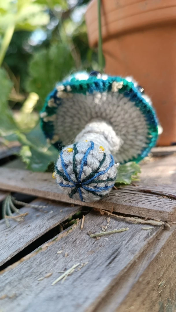 - Couleurs : Amanite bleu vert et blanc sporifique , pied gris avec des détails brodés.