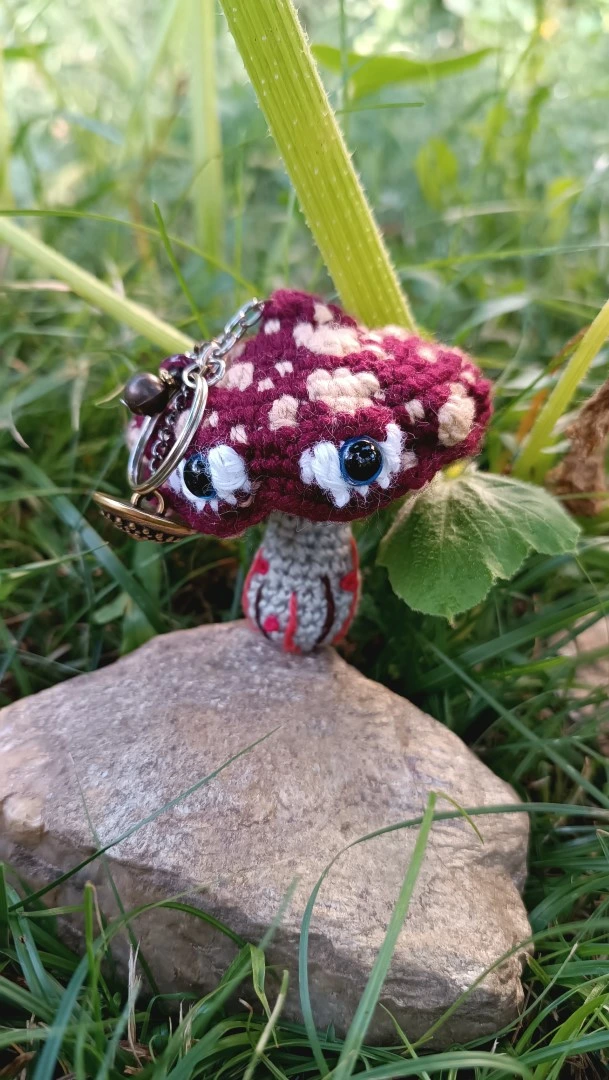 Voici une jolie Amanite bordeaux et beige sporifique, une pièce unique crochetée à la main, prête à prendre place parmi vos clés. Inspiré par les champignons et la chanson culte