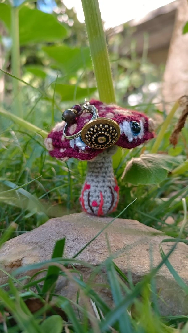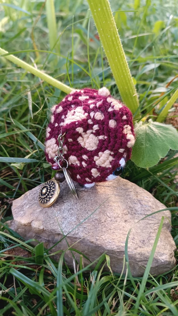 Porte-clés , champignon , Champi’fou Bordeaux aux spores beige psychédélique, crocheté main acrylique, ouate hypoallergénique