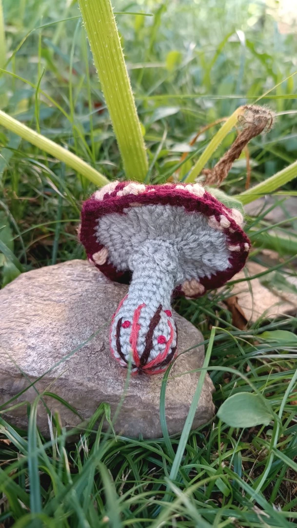 - Couleurs : Chapeau bordeaux avec des spores beige , pied gris avec des détails brodés.