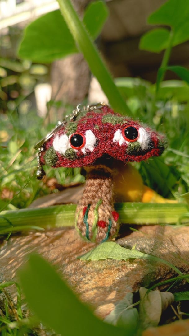 Porte-clés , champignon , Champi’fou bordeaux aux spores vert psychédélique, crocheté main acrylique, ouate hypoallergénique , boutons apprêt