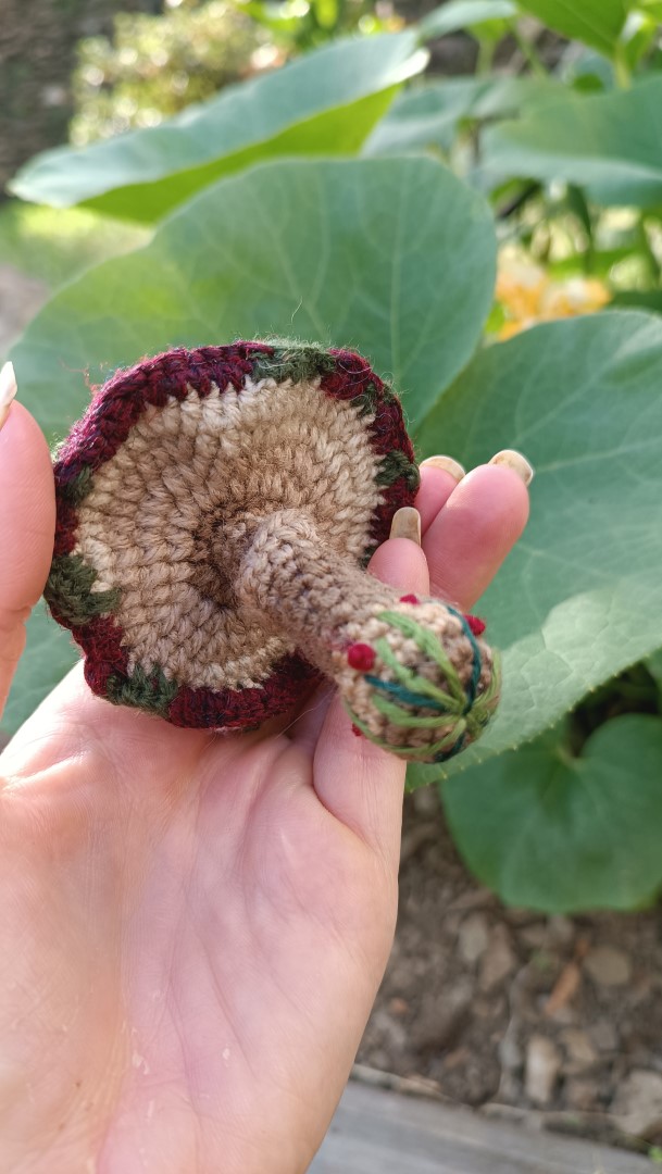 - Couleurs : Chapeau bordeaux avec des spores jaunes, pied beige avec des détails noirs brodés.