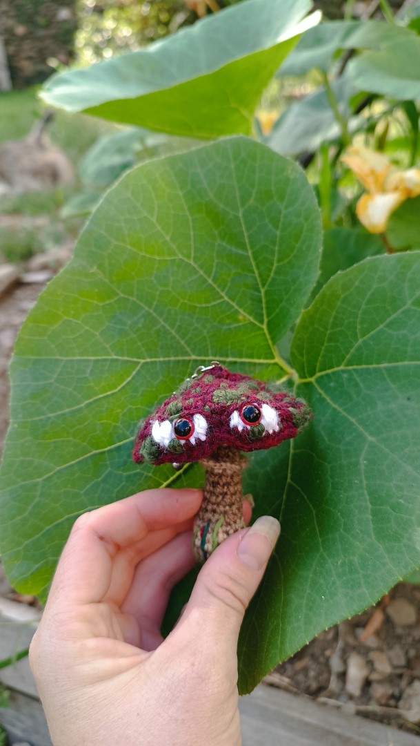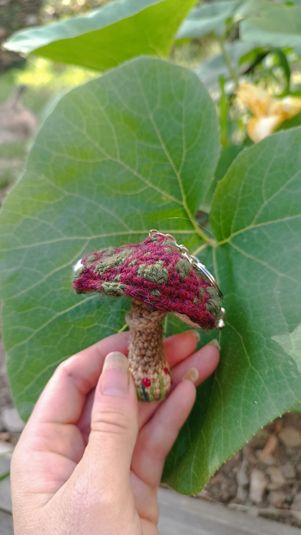 Voici une jolie Amanite bordeaux, au vert sporifique, une pièce unique crochetée à la main, prête à prendre place parmi vos clés. Inspiré par les champignons et la chanson culte