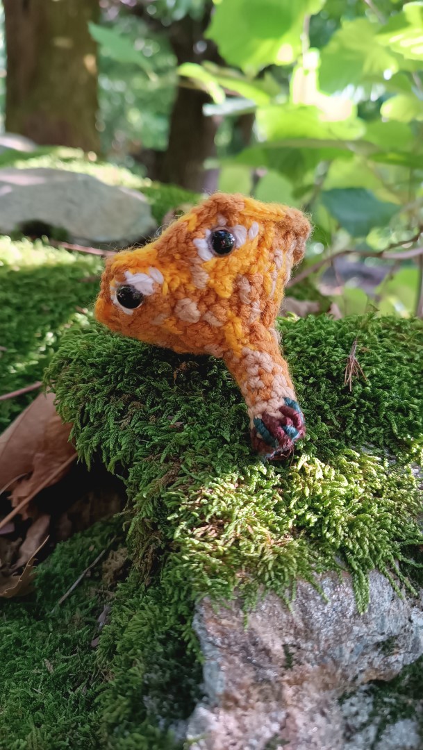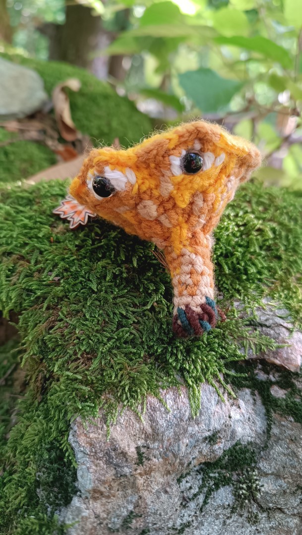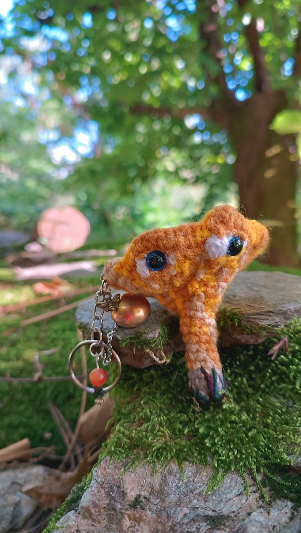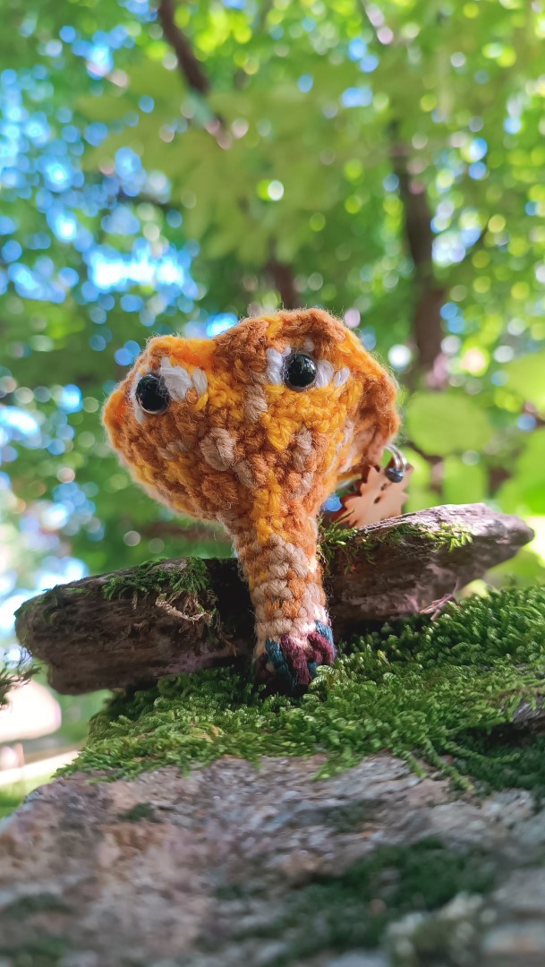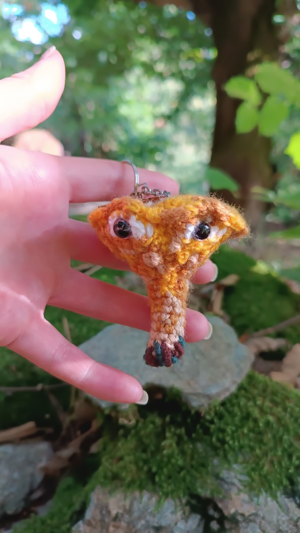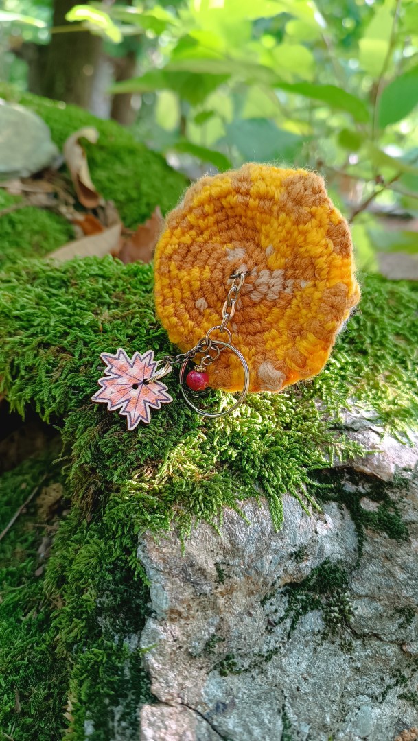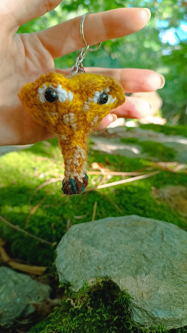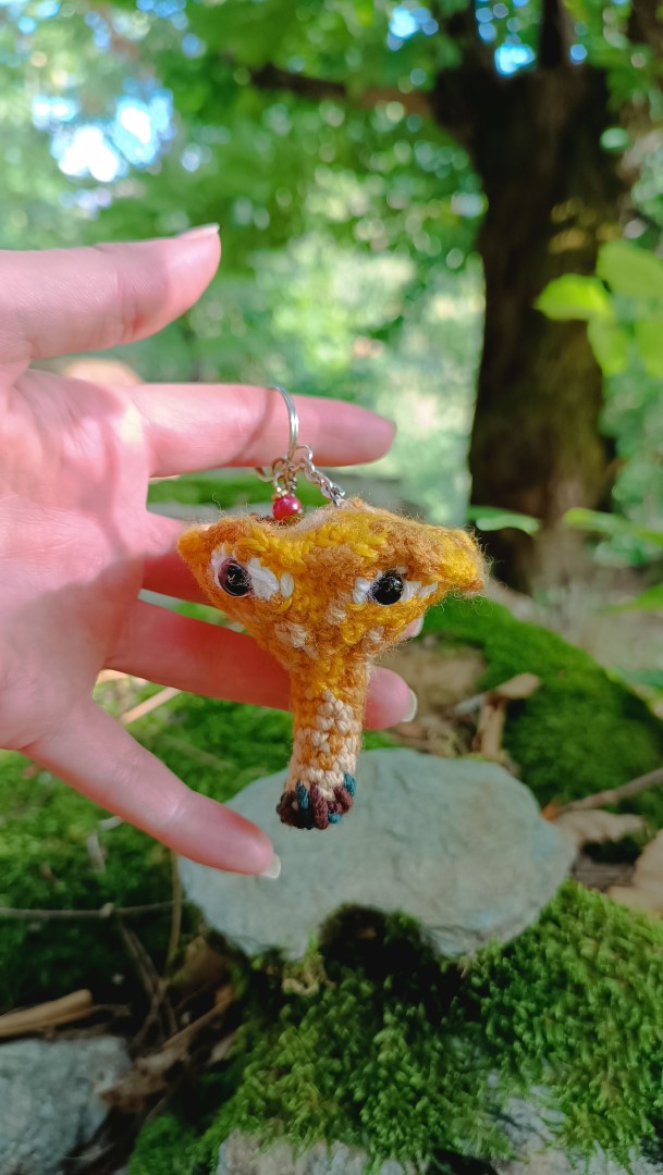 Porte-clés , champignon , Champi’fou Miss Gigi la Girolle, aux yeux clair accroche millieu , crocheté main acrylique, ouate hypoallergénique
