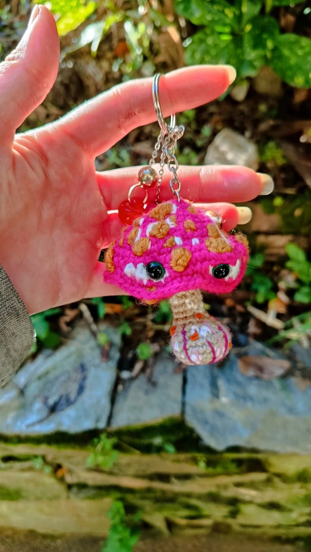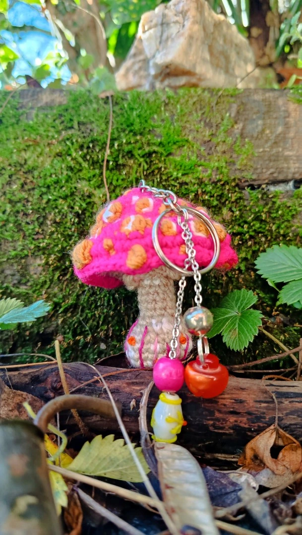 Porte-clés , champignon , Champi’fou rose fluo et aux spores moutarde blanc psychédélique, crocheté main acrylique, ouate hypoallergénique