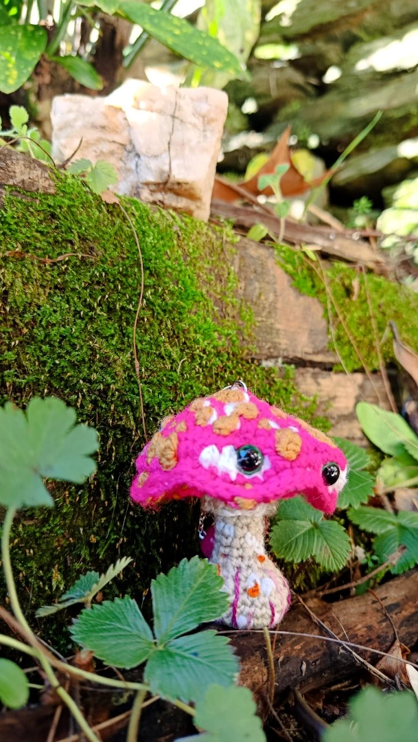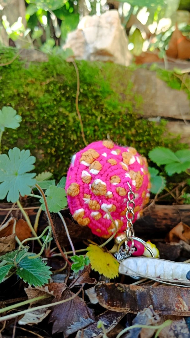 Voici une jolie Amanite rose fluo et aux spores moutarde blanc , une pièce unique crochetée à la main, prête à prendre place parmi vos clés. Inspiré par les champignons et la chanson culte