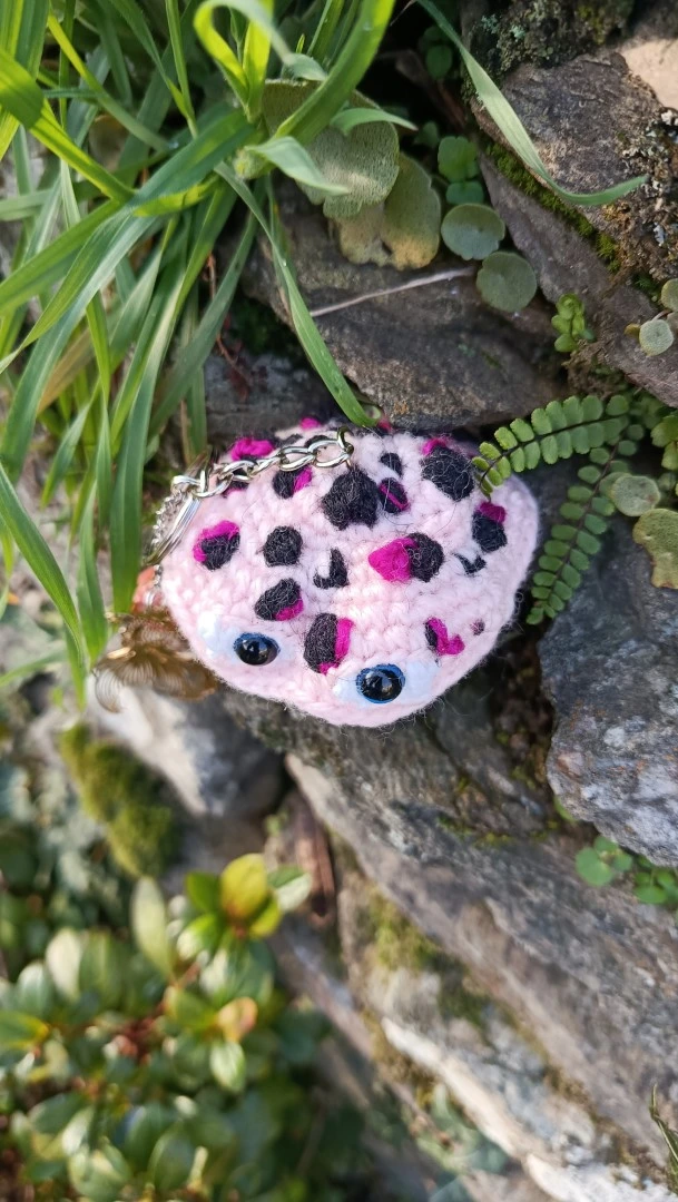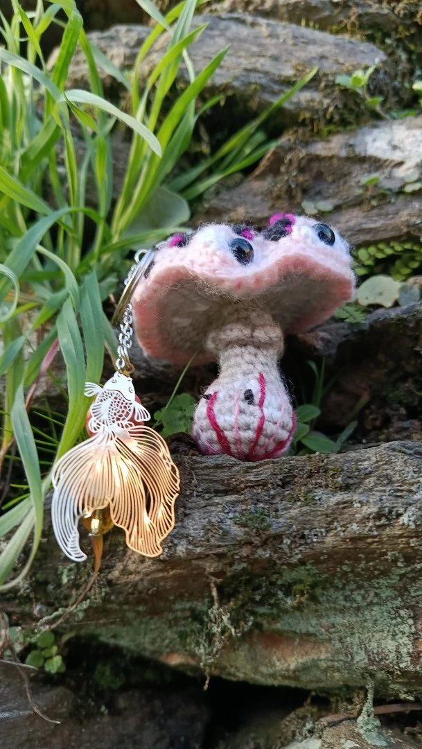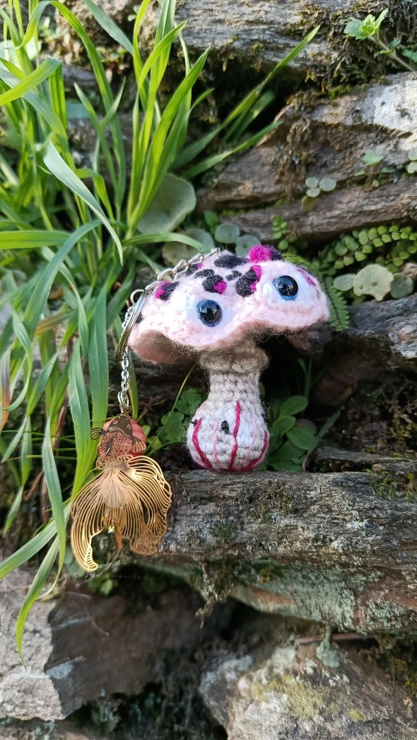 Voici une jolie Amaniterose poudré aux spore noir et fushia , une pièce unique crochetée à la main, prête à prendre place parmi vos clés. Inspiré par les champignons et la chanson culte