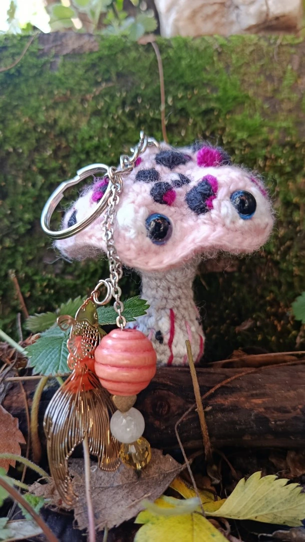Porte-clés , champignon , Champi’fou rose poudré aux spore noir et fushia psychédélique, crocheté main acrylique, ouate hypoallergénique