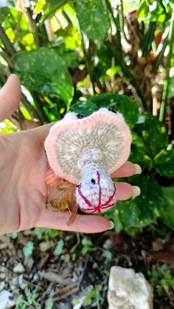 - Couleurs : Amanite rose poudré aux spore noir et fushia , pied beige avec des détails brodés.