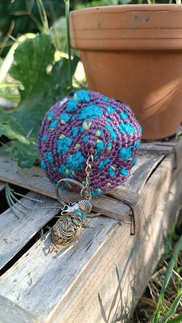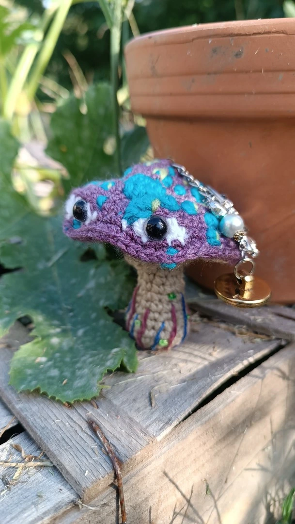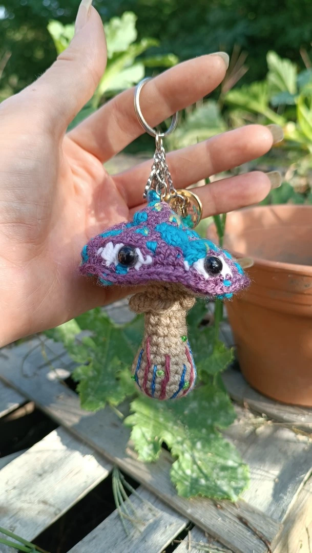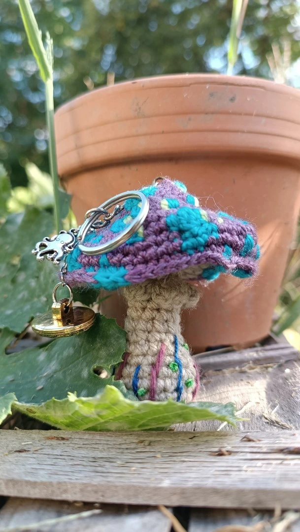 Porte-clés , champignon , Champi’fou violet aux spores bleu et vert psychédélique, crocheté main acrylique, ouate hypoallergénique