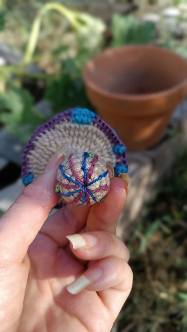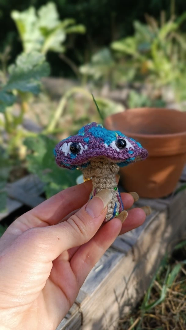 - Couleurs : Amanite bleu violet ( clair / parme) et bleu sporifique , pied gris avec des détails brodés.