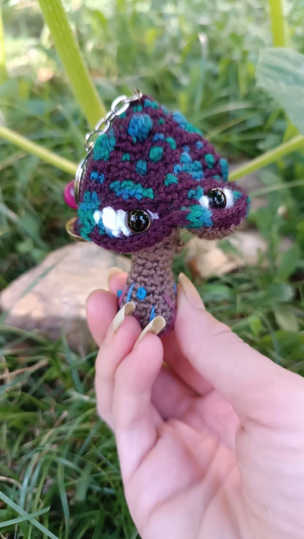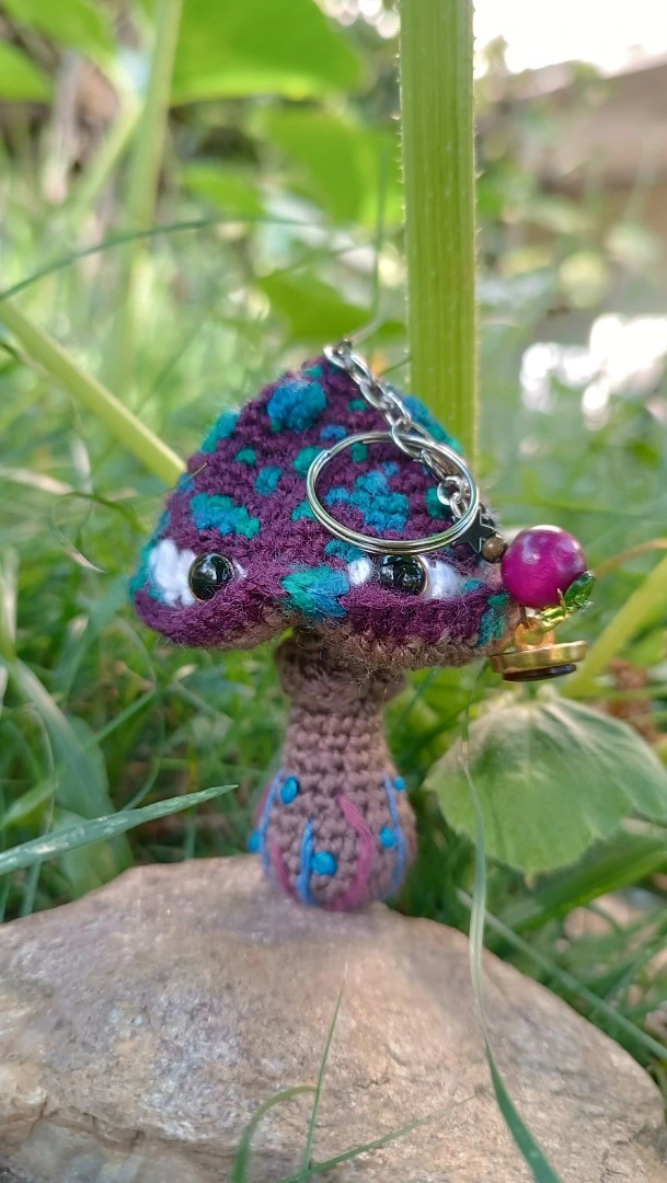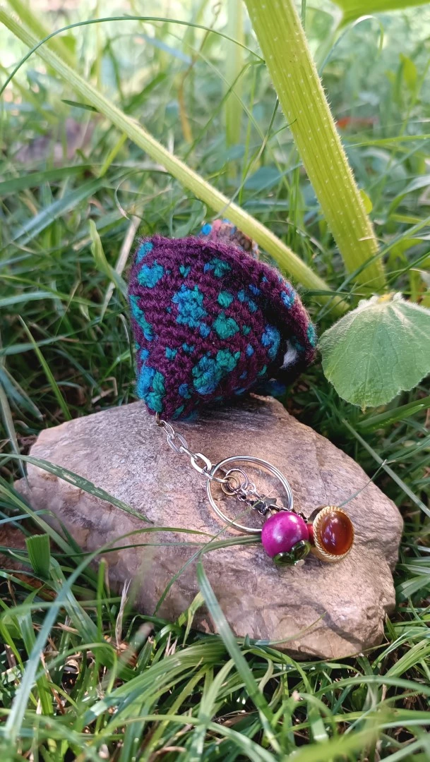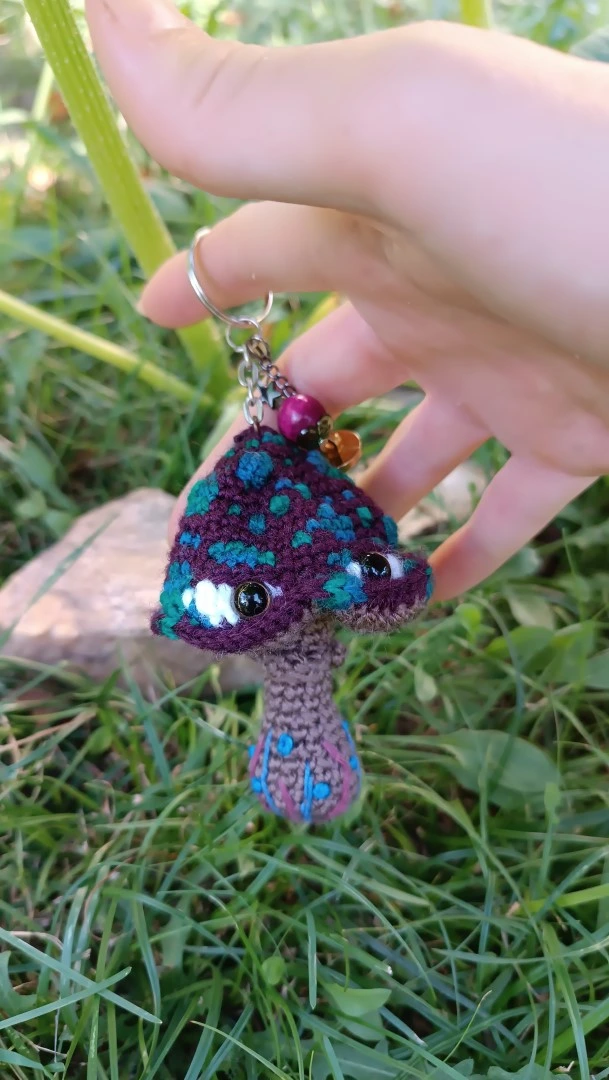 Porte-clés , champignon , Champi’fou Violet aux spores bleu vert psychédélique, crocheté main acrylique, ouate hypoallergénique