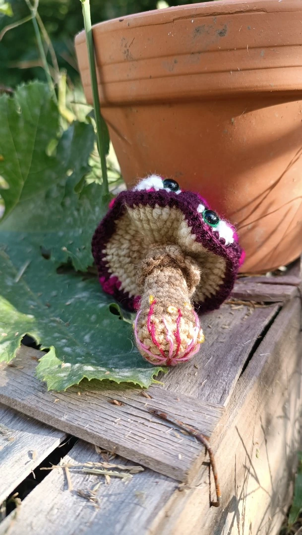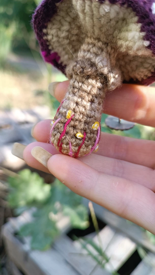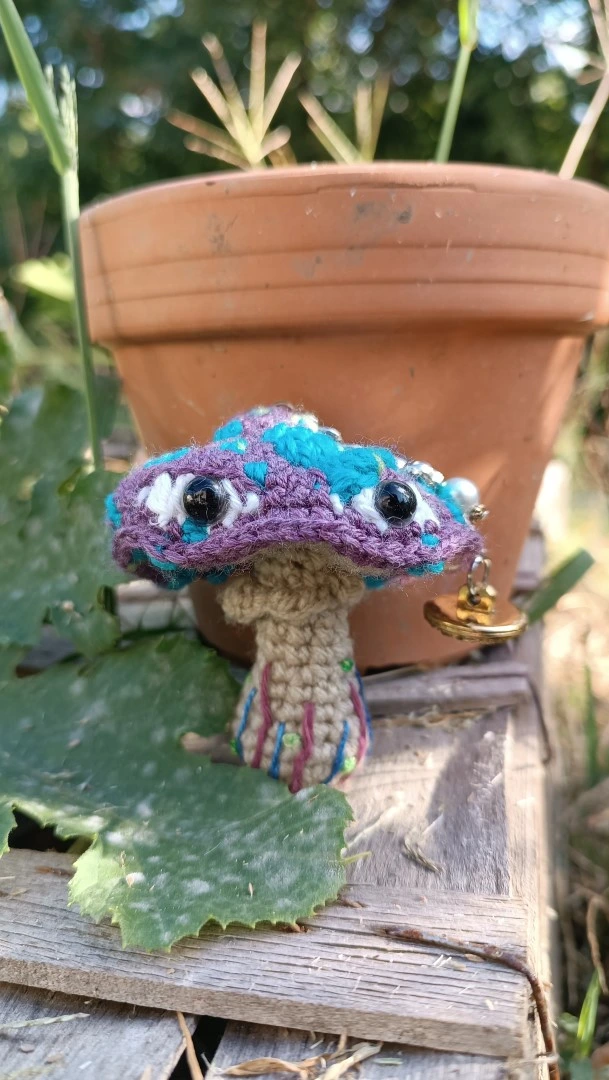 - Couleurs : Amanite bleu violet ( foncé) et fushia sporifique , pied gris avec des détails brodés.