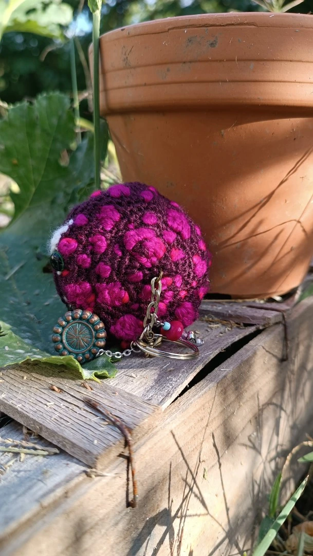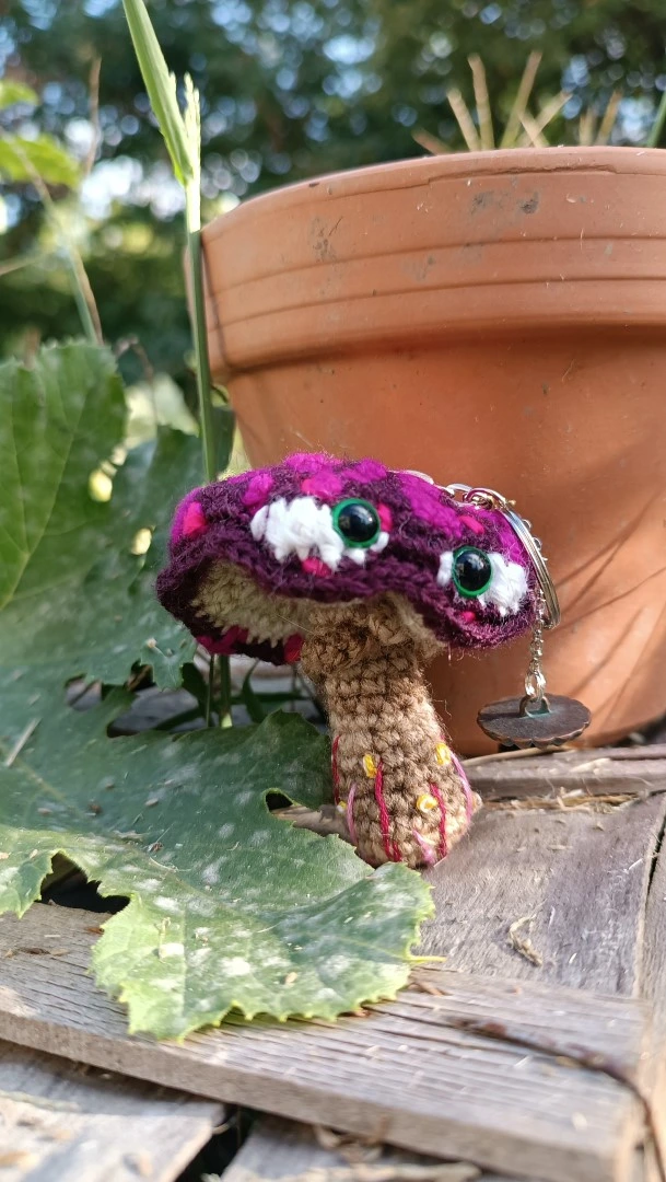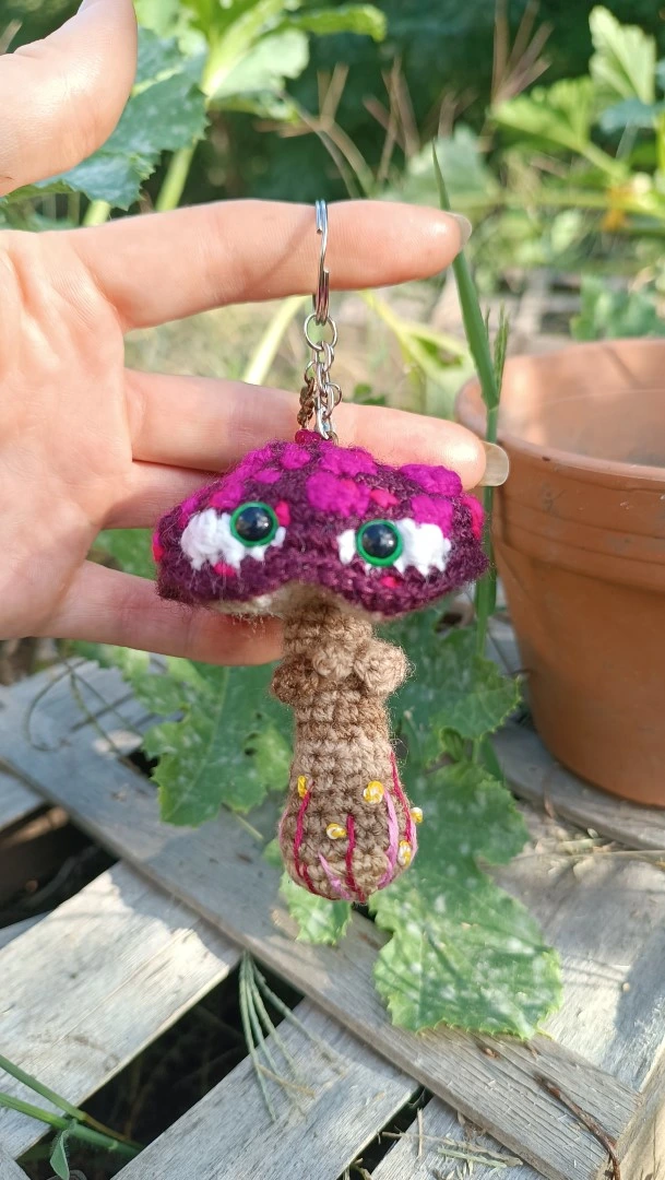 Porte-clés , champignon , Champi’fou violet aux spores fushia psychédélique, crocheté main acrylique, ouate hypoallergénique