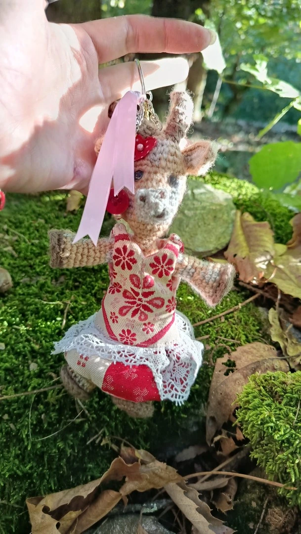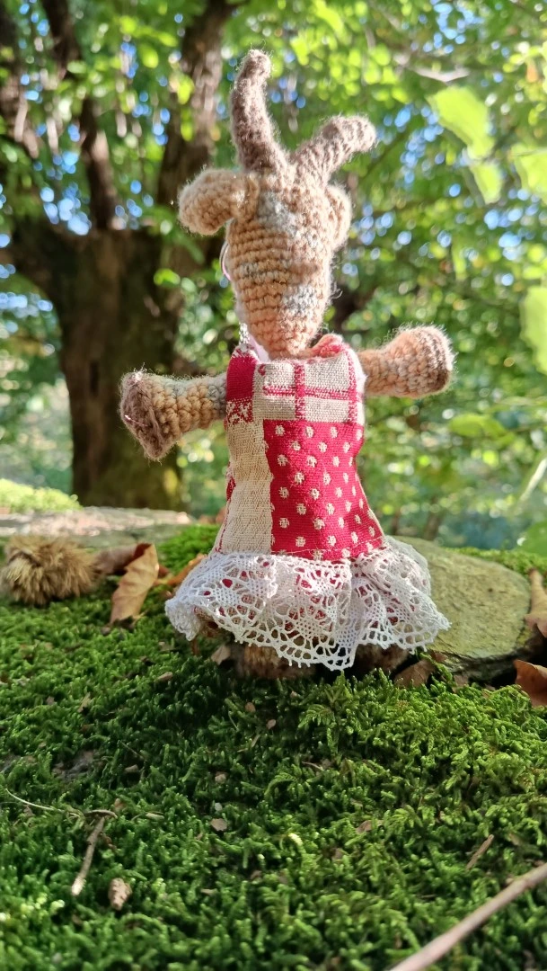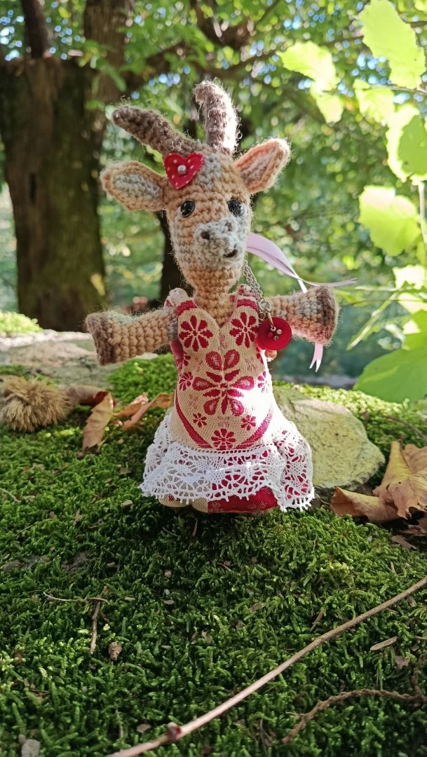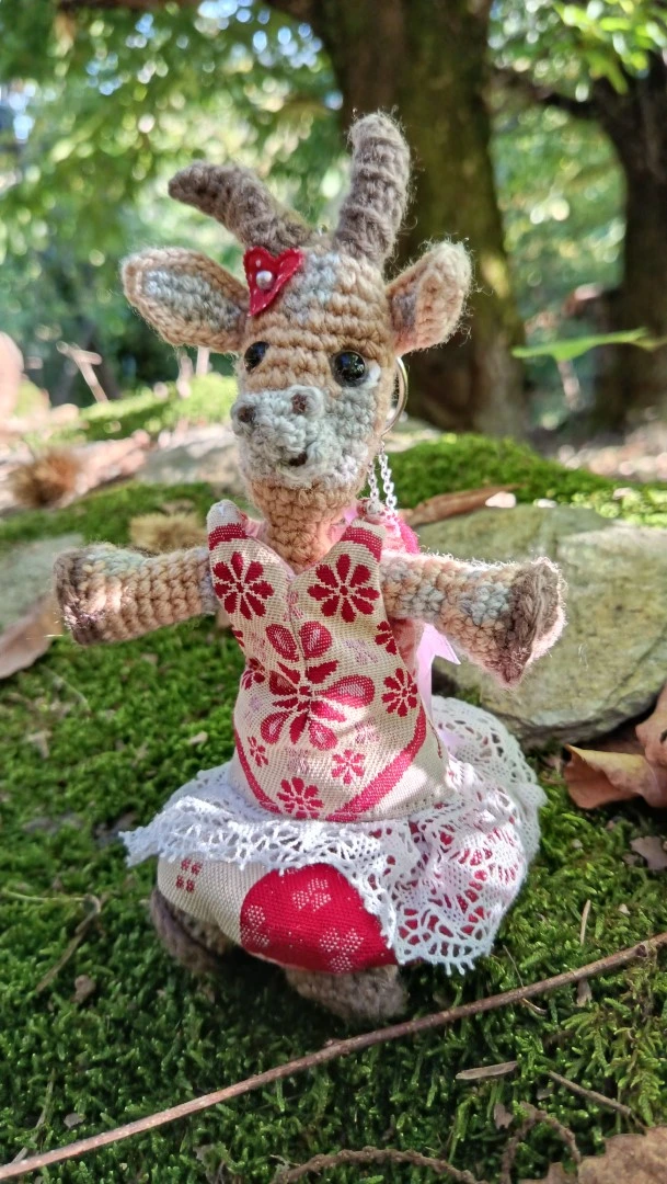 Chaque biquette est une créature unique, crochetée main avec des fils variés (naturels ou acryliques, selon les trouvailles), parée d’une robe cousue et patronnée à l’atelier : tissu imprimé rouge fleuri, dentelle ancienne et petit cœur en feutrine brodé.
